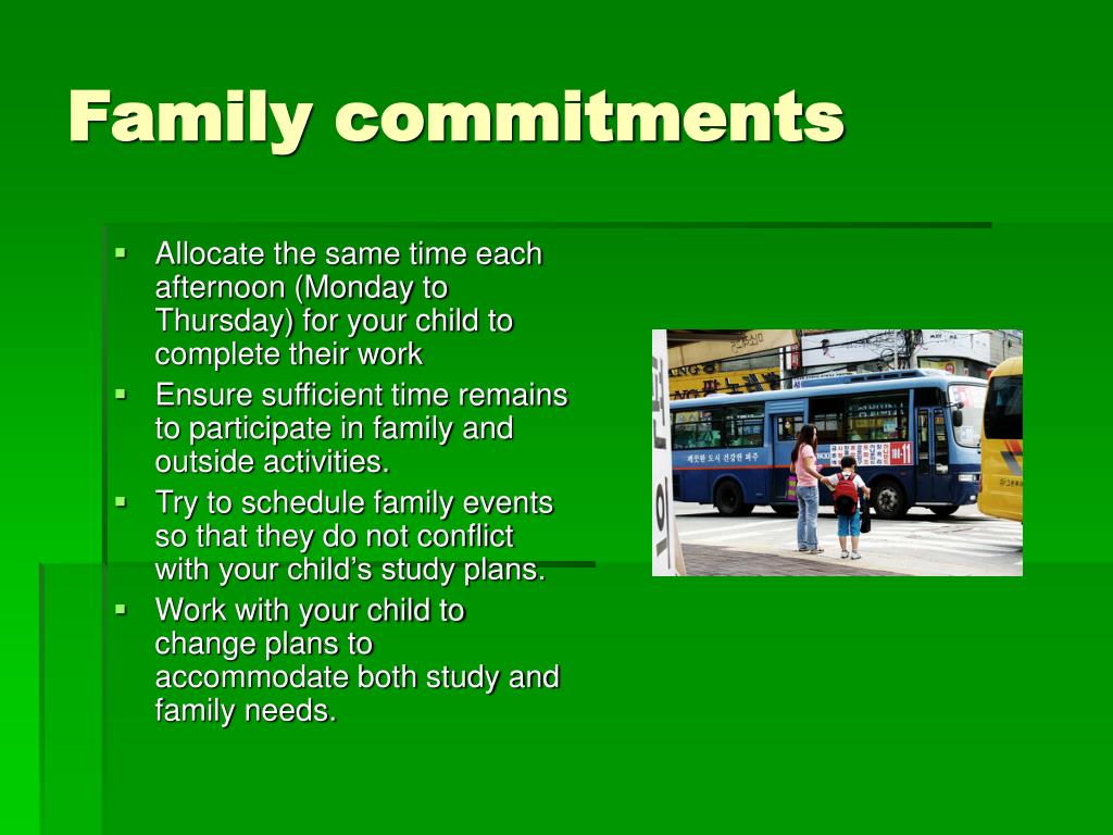 Family commitments • Allocate the same time each afternoon (Monday to Thursday) for your child to complete their work • Ensure sufficient time remains to participate in family and outside activities. • Try to schedule family events so that they do not conflict with your child’s study plans. • Work with your child to change plans to accommodate both study and family needs.
