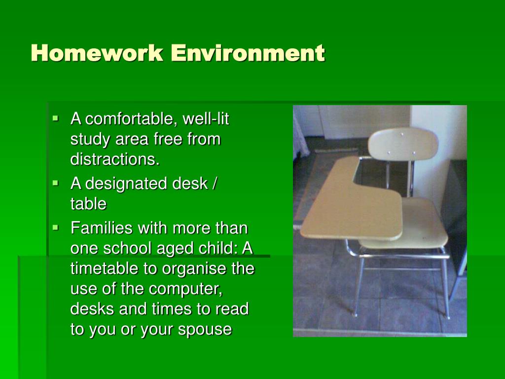 Homework Environment • A comfortable, well-lit study area free from distractions. • A designated desk / table • Families with more than one school aged child: A timetable to organise the use of the computer, desks and times to read to you or your spouse