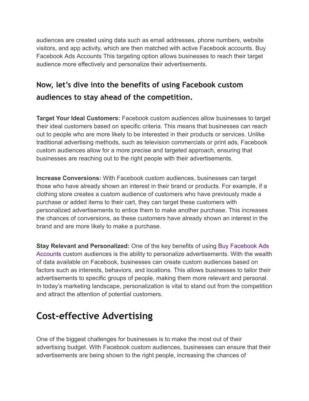 audiences are created using data such as email addresses, phone numbers, website visitors, and app activity, which are then matched with active Facebook accounts. Buy Facebook Ads Accounts This targeting option allows businesses to reach their target audience more effectively and personalize their advertisements. Now, let’s dive into the benefits of using Facebook custom audiences to stay ahead of the competition. Target Your Ideal Customers: Facebook custom audiences allow businesses to target their ideal customers based on specific criteria. This means that businesses can reach out to people who are more likely to be interested in their products or services. Unlike traditional advertising methods, such as television commercials or print ads, Facebook custom audiences allow for a more precise and targeted approach, ensuring that businesses are reaching out to the right people with their advertisements. Increase Conversions: With Facebook custom audiences, businesses can target those who have already shown an interest in their brand or products. For example, if a clothing store creates a custom audience of customers who have previously made a purchase or added items to their cart, they can target these customers with personalized advertisements to entice them to make another purchase. This increases the chances of conversions, as these customers have already shown an interest in the brand and are more likely to make a purchase. Stay Relevant and Personalized: One of the key benefits of using Buy Facebook Ads Accounts custom audiences is the ability to personalize advertisements. With the wealth of data available on Facebook, businesses can create custom audiences based on factors such as interests, behaviors, and locations. This allows businesses to tailor their advertisements to specific groups of people, making them more relevant and personal. In today’s marketing landscape, personalization is vital to stand out from the competition and attract the attention of potential customers. Cost-effective Advertising One of the biggest challenges for businesses is to make the most out of their advertising budget. With Facebook custom audiences, businesses can ensure that their advertisements are being shown to the right people, increasing the chances of
