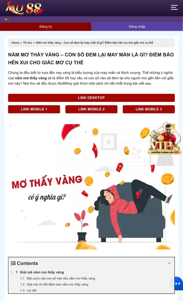 Đăng ký Đăng nhập Home » Tin tức » Nằm mơ thấy vàng – Con số đem lại may mắn là gì? Điềm báo hên xui cho giấc mơ cụ thể NẰM MƠ THẤY VÀNG – CON SỐ ĐEM LẠI MAY MẮN LÀ GÌ? ĐIỀM BÁO HÊN XUI CHO GIẤC MƠ CỤ THỂ Chúng ta đều biết từ xưa đến nay vàng là biểu tượng của may mắn và thịnh vượng. Thế những ý nghĩa của nằm mơ thấy vàng sẽ là điềm tốt hay xấu và con số nào sẽ đem lại cho người mơ gắn liền với giấc mơ này? Mọi thứ sẽ đều được Mu88hey giải thích một cách chi tiết nhất trong bài viết sau. LINK DESKTOP LINK MOBILE 1 LINK MOBILE 2 LINK MOBILE 3 Contents 1 Giải mã nằm mơ thấy vàng 1.1 Đặt cược vào con số nào nếu nằm mơ thấy vàng 1.2 Giải mã chi tiết điềm báo nằm mơ thấy vàng 1.3 Lời kết