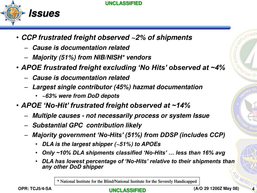 Issues • CCP frustrated freight observed ~2% of shipments • Cause is documentation related • Majority (51%) from NIB/NISH* vendors • APOE frustrated freight excluding ‘No Hits’ observed at ~4% • Cause is documentation related • Largest single contributor (45%) hazmat documentation • ~63% were from DoD depots • APOE ‘No-Hit’ frustrated freight observed at ~14% • Multiple causes - not necessarily process or system Issue • Substantial GPC contribution likely • Majority government ‘No-Hits’ (51%) from DDSP (includes CCP) • DLA is the largest shipper (~51%) to APOEs • Only ~10% DLA shipments classified ‘No-Hits’ … less than 16% avg • DLA has lowest percentage of ‘No-Hits’ relative to their shipments than any other DoD shipper * National Institute for the Blind/National Institute for the Severely Handicapped