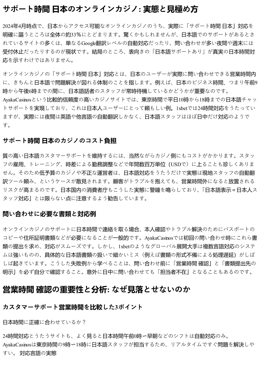 サポート時間日本のオンラインカジノ: 実態と見極め方 2024年4月時点で、日本からアクセス可能なオンラインカジノのうち、実際に「サポート時間日本」対応を 明確に謳うところは全体の約33%にとどまります。驚くかもしれませんが、日本語でのサポートがあるとさ れているサイトの多くは、単なるGoogle翻訳レベルの自動対応だったり、問い合わせが多い夜間や週末には 受付休止だったりするのが現状です。結局のところ、表向きの「日本語サポートあり」が真実の日本時間対 応を示すわけではありません。 オンラインカジノの「サポート時間日本」対応とは、日本のユーザーが実際に問い合わせできる営業時間内 に、きちんと日本語で問題解決が図れる体制のことを指します。例えば、日本のビジネス時間、つまり午前9 時から午後6時までの間に、日本語話者のスタッフが常時待機しているかどうかが重要なのです。 AyakaCasinosという比較的信頼度の高いカジノサイトでは、東京時間で平日10時から18時までの日本語チャッ トサポートを実現しており、これは日本人ユーザーにとって頼もしい例。1xbetでは24時間対応をうたってい ますが、実際には夜間は英語や他言語の自動翻訳しかなく、日本語スタッフはほぼ日中だけ対応のようで す。 サポート時間日本のカジノのコスト負担 質の高い日本語カスタマーサポートを維持するには、当然ながらカジノ側にもコストがかかります。スタッ フの雇用、トレーニング、時差による勤務調整などで年間数百万単位(USDで)に上ることも珍しくありま せん。そのため低予算のカジノや不正な運営者は、日本語対応をうたうだけで実態は現地スタッフの自動翻 訳ツール頼み、というケースが散見されます。顧客がトラブルを抱えても、営業時間外になると放置される リスクが高まるのです。日本国内の消費者庁もこうした実態に警鐘を鳴らしており、 「日本語表示=日本人ス タッフ対応」とは限らない点に注意するよう勧告しています。 問い合わせに必要な書類と対応例 オンラインカジノのサポートに日本時間で連絡を取る場合、本人確認やトラブル解決のためにパスポートの コピーや住所証明書類などが必要になることが一般的です。AyakaCasinosでは初回の問い合わせ時にこれら書 類の提出を求め、対応がスムーズです。しかし、1xbetのようなグローバル展開大手は複数言語対応のシステ ムは強いものの、具体的な日本語書類の扱いで細かいミス(例えば書類の形式不備による処理遅延)がしば しば起きています。こうした失敗例から学べることは、問い合わせ前に「営業時間確認」と「書類提出先の 明示」を必ず自分で確認すること。意外に日中に問い合わせても「担当者不在」となることもあるのです。 営業時間確認の重要性と分析: なぜ見落とせないのか カスタマーサポート営業時間を比較した3ポイント 日本時間に正確に合わせているか? 24時間対応とうたうサイトも、よく見ると日本時間午前0時〜早朝などのシフトは自動対応のみ。 AyakaCasinosは東京時間の9時〜18時に日本語スタッフが担当するため、リアルタイムですぐ問題を解決しや すい。対応言語の実態