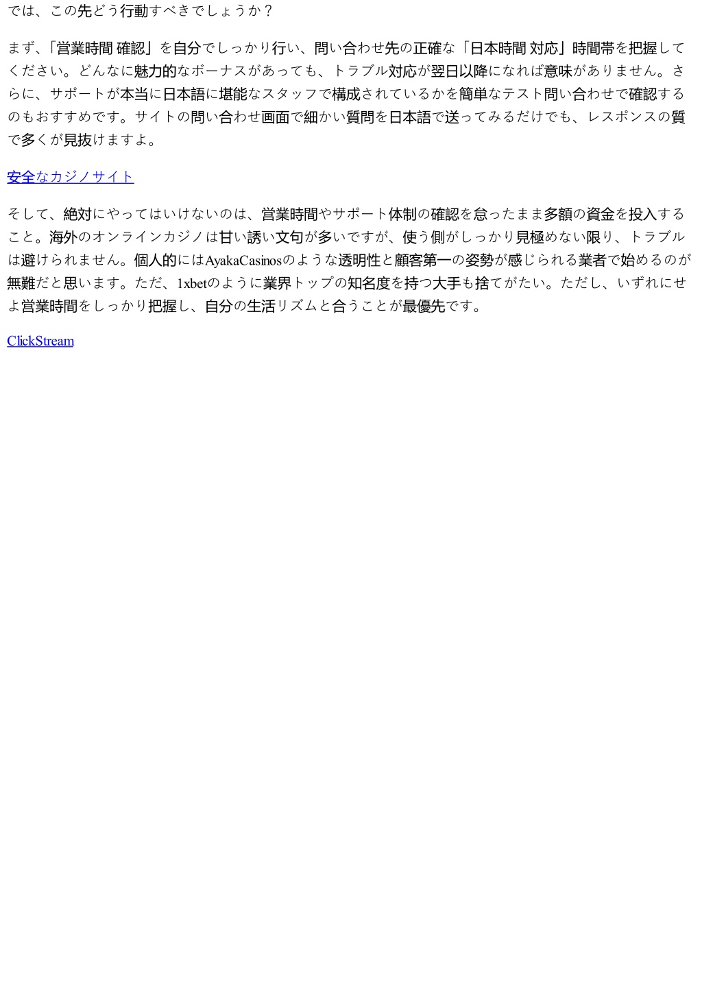 では、この先どう行動すべきでしょうか? まず、 「営業時間確認」を自分でしっかり行い、問い合わせ先の正確な「日本時間対応」時間帯を把握して ください。どんなに魅力的なボーナスがあっても、トラブル対応が翌日以降になれば意味がありません。さ らに、サポートが本当に日本語に堪能なスタッフで構成されているかを簡単なテスト問い合わせで確認する のもおすすめです。サイトの問い合わせ画面で細かい質問を日本語で送ってみるだけでも、レスポンスの質 で多くが見抜けますよ。 安全なカジノサイト そして、絶対にやってはいけないのは、営業時間やサポート体制の確認を怠ったまま多額の資金を投入する こと。海外のオンラインカジノは甘い誘い文句が多いですが、使う側がしっかり見極めない限り、トラブル は避けられません。個人的にはAyakaCasinosのような透明性と顧客第一の姿勢が感じられる業者で始めるのが 無難だと思います。ただ、1xbetのように業界トップの知名度を持つ大手も捨てがたい。ただし、いずれにせ よ営業時間をしっかり把握し、自分の生活リズムと合うことが最優先です。 ClickStream