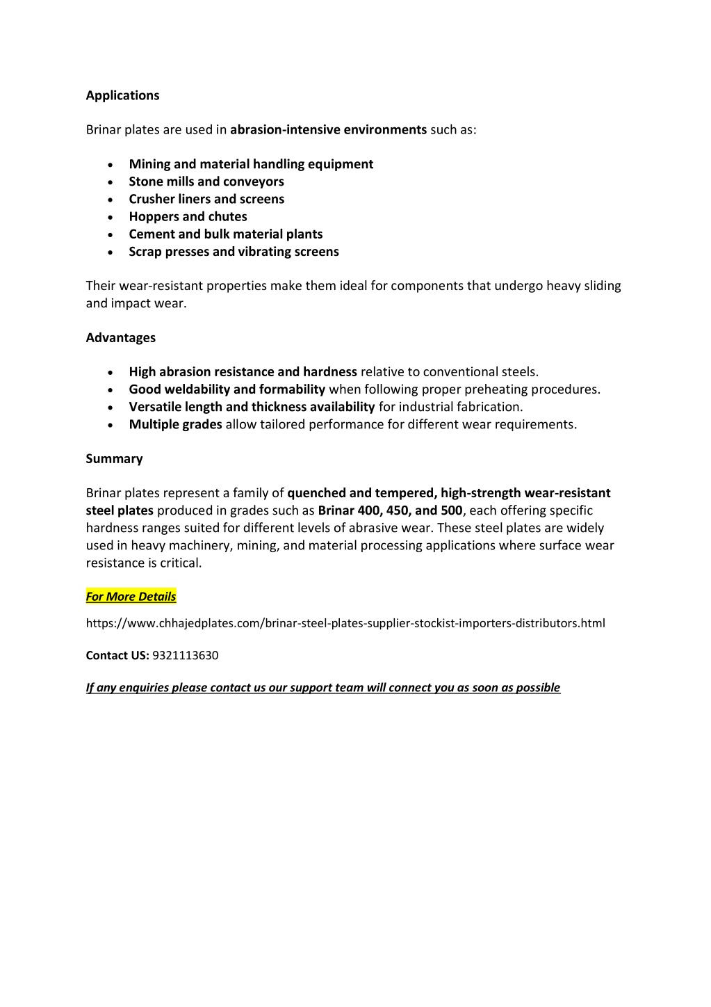 Applications Brinar plates are used in abrasion-intensive environments such as: Mining and material handling equipment Stone mills and conveyors Crusher liners and screens Hoppers and chutes Cement and bulk material plants Scrap presses and vibrating screens Their wear-resistant properties make them ideal for components that undergo heavy sliding and impact wear. Advantages High abrasion resistance and hardness relative to conventional steels. Good weldability and formability when following proper preheating procedures. Versatile length and thickness availability for industrial fabrication. Multiple grades allow tailored performance for different wear requirements. Summary Brinar plates represent a family of quenched and tempered, high-strength wear-resistant steel plates produced in grades such as Brinar 400, 450, and 500, each offering specific hardness ranges suited for different levels of abrasive wear. These steel plates are widely used in heavy machinery, mining, and material processing applications where surface wear resistance is critical. For More Details https://www.chhajedplates.com/brinar-steel-plates-supplier-stockist-importers-distributors.html Contact US: 9321113630 If any enquiries please contact us our support team will connect you as soon as possible