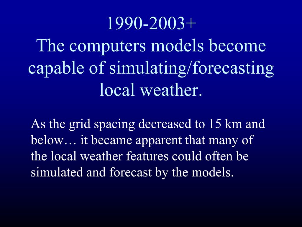 1990-2003+The computers models become capable of simulating/forecasting local weather. As the grid spacing decreased to 15 km and below… it became apparent that many of the local weather features could often be simulated and forecast by the models.