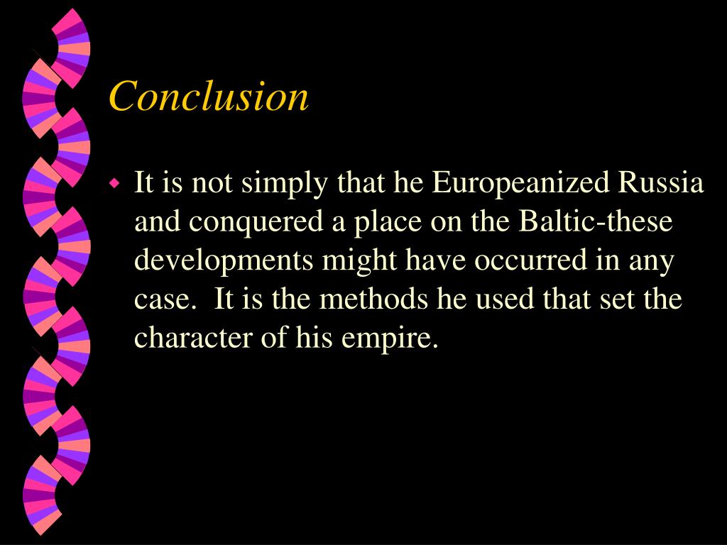 Conclusion • It is not simply that he Europeanized Russia and conquered a place on the Baltic-these developments might have occurred in any case. It is the methods he used that set the character of his empire.