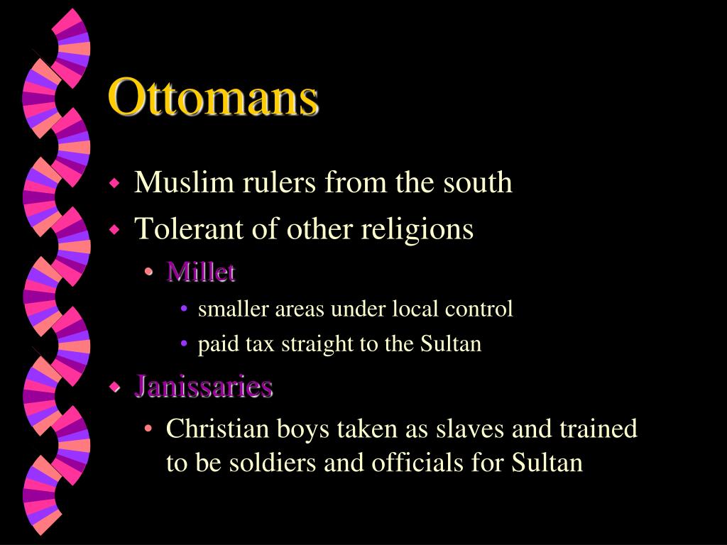 Ottomans • Muslim rulers from the south • Tolerant of other religions • Millet • smaller areas under local control • paid tax straight to the Sultan • Janissaries • Christian boys taken as slaves and trained to be soldiers and officials for Sultan