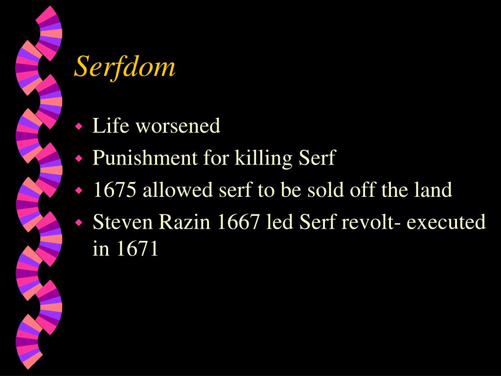 Serfdom • Life worsened • Punishment for killing Serf • 1675 allowed serf to be sold off the land • Steven Razin 1667 led Serf revolt- executed in 1671