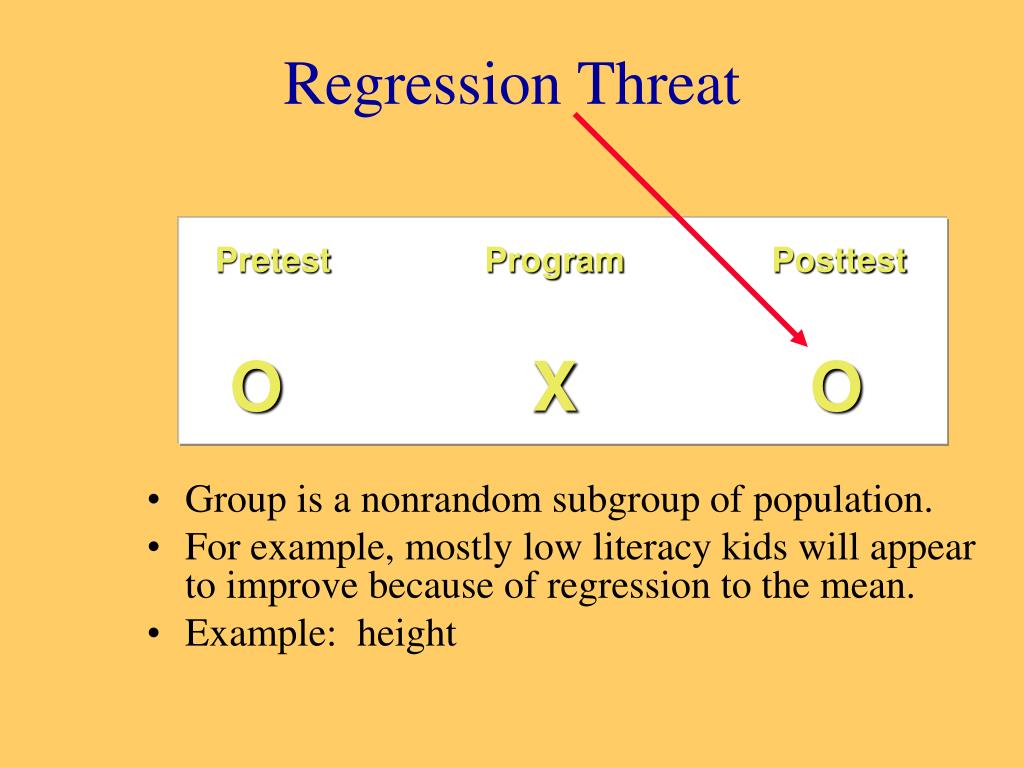 Pretest Program Posttest O X O Regression Threat • Group is a nonrandom subgroup of population. • For example, mostly low literacy kids will appear to improve because of regression to the mean. • Example: height