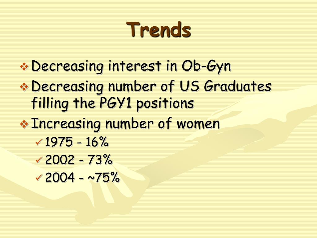 Trends • Decreasing interest in Ob-Gyn • Decreasing number of US Graduates filling the PGY1 positions • Increasing number of women • 1975 - 16% • 2002 - 73% • 2004 - ~75%