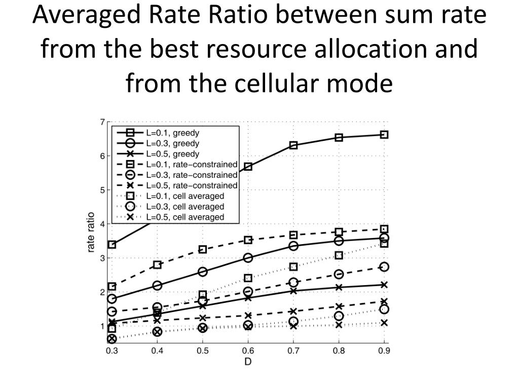 Averaged Rate Ratio between sum rate from the best resource allocation and from the cellular mode