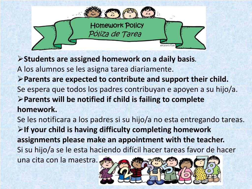 Homework Policy Póliza de Tarea • Students are assigned homework on a daily basis. A los alumnos se les asigna tarea diariamente. • Parents are expected to contribute and support their child. Se espera que todos los padres contribuyan e apoyen a su hijo/a. • Parents will be notified if child is failing to complete homework. Se les notificara a los padres si su hijo/a no esta entregando tareas. • If your child is having difficulty completing homework assignments please make an appointment with the teacher. Si su hijo/a se le esta haciendo difícil hacer tareas favor de hacer una cita con la maestra.