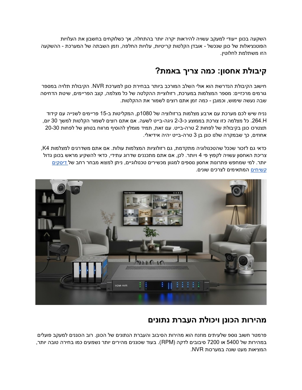 תויולעה תא ןובשחב םיחקולשכ ךא ,הלחתהב רתוי הרקי תואריהל היושע בקעמל ידועיי ןנוכב העקשה פלחה תויולע ,תויטירק תוטלקה ןדבוא תכרעמה לש התבשה ןמזו ,ה - העקשהה לשכנש ןנוכ לש תולאיצנטופה - .ןיטולחל תמלתשמ וזה ?תמאב ךירצ המכ :ןוסחא תלוביק תכרעמל ןנוכ תריחבב רתויב בכרומה בלשה ילוא אוה תשרדנה תלוביקה בושיח NVR ש ,םימיירפה בצק ,המלצמ לכ לש הטלקהה תייצולוזר ,תכרעמב תומלצמה רפסמ :םייזכרמ םימרוג הסיחדה תטי .תוטלקהה תא רומשל םיצור םתא ןמז המכ רפסמב היולת תלוביקה . ןבומכו ,שומיש השענ הבש - p דודיק םע היינשל םימיירפ ךשמל תוטלקה רומשל םיצור םתא םא .העשל טייב 30 םוי תוחפל לש ןוחטב חוורמ ףיסוהל ץלמומ דימת ,תאז םע .טייב 20-30 15 ב תוטילקמה , - לש היצולוזרב תומלצמ עברא םע תכרעמ םכל שיש חיננ 1080 כ עצוממב תכרוצ וזכ המלצמ לכ . - 2-3 הגיג - תוחפל לש תלוביקב ןנוכ וכרטצת 2 הרט - ןב ןנוכ ונלש הרקמבש ךכ ,םיזוחא 3 הרט - .ילאידיא היהי טייב H , 264 . K , תומלצמל םיגרדשמ םתא םא .תולוע תומלצמה תויצולוזר םג ,תמדקתמ היגולונכטהש לככש רוכזל םג יאדכ לודג ןנוכב שארמ עיקשהל יאדכ ,ידיתע גורדש םיננכתמ םתא םא ,ןכל .רתויו לש בחר רחבמ אוצמל ןתינ ,םייגולונכט םירישכמ ןווגמל םיפסונ ןוסחא תונורתפ שפחמש ימל .רתוי םיקסיד 4 4 יפ ץופקל היושע ןו סחאה תכירצ .םינוש םיכרצל םימיאתמה םיחישק םינותנ תרבעה תלוכיו ןנוכה תוריהמ םילעופ בקעמל םיננוכה בור .ןנוכה לש םינותנה תרבעהו בו ,רתוי הבוט הריחב ומכ םיעמשנ רתוי םיריהמ םיננוכש דועב .) ביסה תוריהמ אוה חנזומ םיתיעלש פסונ בושח רטמרפ 7200 ( הקדל םיבוביס RPM תוכרעמב הנוש טעמ תואיצמה NVR . וא 5400 לש תוריהמב