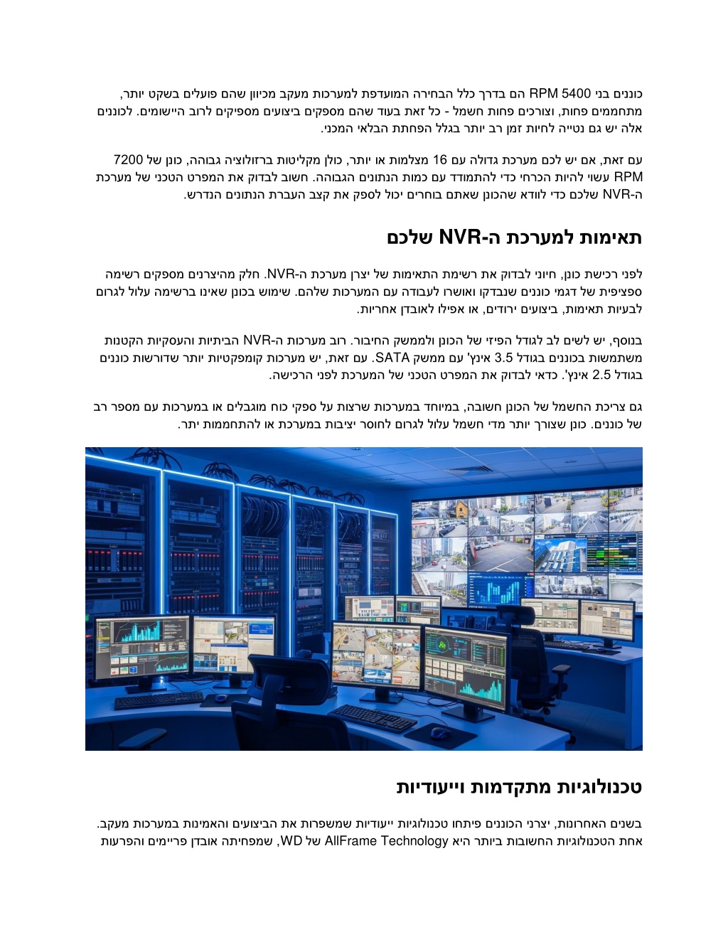 RPM םהש ןוויכמ בקעמ תוכרעמל תפדעומה הריחבה ללכ ךרדב םה םיננוכל .םימושייה בורל םיקיפסמ םיעוציב םיקפסמ םהש דועב תאז לכ ,רתוי טקשב םילעופ 5400 ינב םיננוכ למשח תוחפ םיכרוצו ,תוחפ םיממחתמ - .ינכמה יאלבה תתחפה ללגב רתוי בר ןמז תויחל הייטנ םג שי הלא וכ ,ההובג היצולוזרב תוטילקמ ןלוכ ,רתוי וא תומלצמ תכרעמ לש ינכטה טרפמה תא קודבל בושח .ההובגה םינותנה תומכ םע דדומתהל ידכ יחרכה תויהל יושע .שרדנה םינותנה תרבעה בצק תא קפסל לוכי םירחוב םתאש ןנוכהש אדוול ידכ םכלש 7200 לש ןנ 16 םע הלודג תכרעמ םכל שי םא ,תאז םע RPM NVR - ה NVR םכלש - ה תכרעמל תומיאת ה תכרעמ ןרצ - NVR המישר םיקפסמ םינרציהמ קלח . םורגל לולע המישרב וניאש ןנוכב שומיש .םהלש תוכרעמה םע הדובעל ורשואו וקדבנש םיננוכ ימגד לש תיפיצפס .תוירחא ןדבואל וליפא וא ,םידורי םיעוציב ,תומיאת תויעבל י לש תומיאתה תמישר תא קודבל ינויח ,ןנוכ תשיכר ינפל NVR תונטקה תויקסעהו תויתיבה םיננוכ תושרודש רתוי תויטקפמוק תוכרעמ שי ,תאז םע . רעמ בור .רוביחה קשממלו ןנוכה לש יזיפה לדוגל בל םישל שי ,ףסונב קשממ םע 'ץניא SATA .השיכרה ינפל תכרעמה לש ינכטה טרפמה תא קודבל יאדכ .'ץניא ה תוכ - 3.5 לדוגב םיננוכב תושמתשמ 2.5 לדוגב בר רפסמ םע תוכרעמב וא םילבגומ ח וכ יקפס לע תוצרש תוכרעמב דחוימב ,הבושח ןנוכה לש למשחה תכירצ םג .רתי תוממחתהל וא תכרעמב תוביצי רסוחל םורגל לולע למשח ידמ רתוי ךרוצש ןנוכ .םיננוכ לש תוידועייו תומדקתמ תויגולונכט .בקעמ תוכרעמב תונימאהו םיעוציבה תא תורפשמש תוידועיי תויגולונכט וחתיפ םיננוכה ינרצי ,תונורחאה םינשב AllFrame Technology לש WD תוערפהו םימיירפ ןדבוא התיחפמש , איה רתויב תובושחה תויגו לונכטה תחא