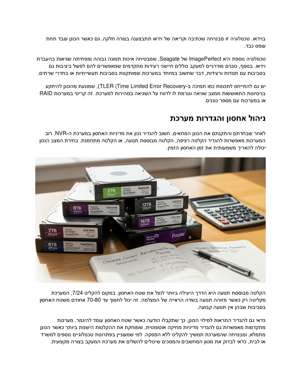 תחת דבוע ןנוכה רשאכ םג ,הקלח הרוצב הנעצבתת ואדיו לש האירקו הביתכש החיטבמ וז היגולונכט .ואדיוב .דבכ סמוע Seagate ImagePerfect תרבעהב תואיגש התיחפמו םג תוביציב לועפל םהל םירשפאמש םימדקתמ תודיער ינשייח םיללוכ בקעמל םיינרדומ םיננוכ ,ףסונב .ואדיו .םיתרש ירדחב וא תויתיישעת תוביבסב תונקתומש תוכרעמב דחוימב בושחש רבד ,תודיערו תודונת םע תוביבסב ההובג הנומת תוכיא החיטבמש , לש איה תפסונ היגולונכט TLER (Time Limited Error Recovery עקתיהל ןנוכהמ תענומש ,) תוכרעמב יטירק הז .תכרעמל תוריהמב האיגשה לע חוודל ול תמרוגו האיגש בצממ תוששואתה תונויסינב RAID ב הכימת ומכ תונוכתל סחייתהל םג שי - .םיננוכ רפסמ םע תוכרעמב וא תכרעמ תורדגהו ןוסחא לוהינ ינידמ תא ןוכנ רידגהל בושח ,םיאתמה ןנוכה תא םתנקתהו םתרחבש רחאל ה תכרעמב ןוסחאה תו - NVR ןוכנה בצמה תריחב .תנמזותמ הטלקה וא ,העונת תססובמ הטלקה ,הפיצר הטלקה רידגהל תורשפאמ תוכרעמה בור . .ןימזה ןוסחאה ןמז תא תיתועמשמ ךיראהל הלוכי טילקהל םוקמב .ןוסחאה חטש תא לצנל רתויב הליעיה ךרדה איה העונת תססובמ הטלקה דע ךוסחל לוכי הז .המלצמה לש הייארה הדשב העונת ההוזמ רשאכ קר ה 70-80 ןוסחאה חטשמ םיזוחא תכרעמה , / 7 24 טילקמ .העובק העונת ןיא ןהבש תוביבסב תוכרעמ .רמגיהל דמוע ןוסחאה חטש רשאכ העדוה ולבקתש ךכ ,ןנוכה יולימל תוארתה רידגהל םג יאדכ ש ,תיטמוטוא הקיחמ תוינידמ רידגהל םג תורשפאמ תומדקתמ ןנוכה רשאכ רתויב תונשיה תוטלקהה תא תקחומ דרשמל םיפסונ םייגולונכט תונורתפב ןיינועמש ימל .הקספה אלל טילקהל ךישמת תכרעמהש החיטבמו ,אלמתמ .תיעוצקמ הרוצב בקעמה תכרעמ תא םילשהל םילוכיש םיכסמהו םיבשחמה ןווגמ תא קודבל יאדכ ,תיבל וא