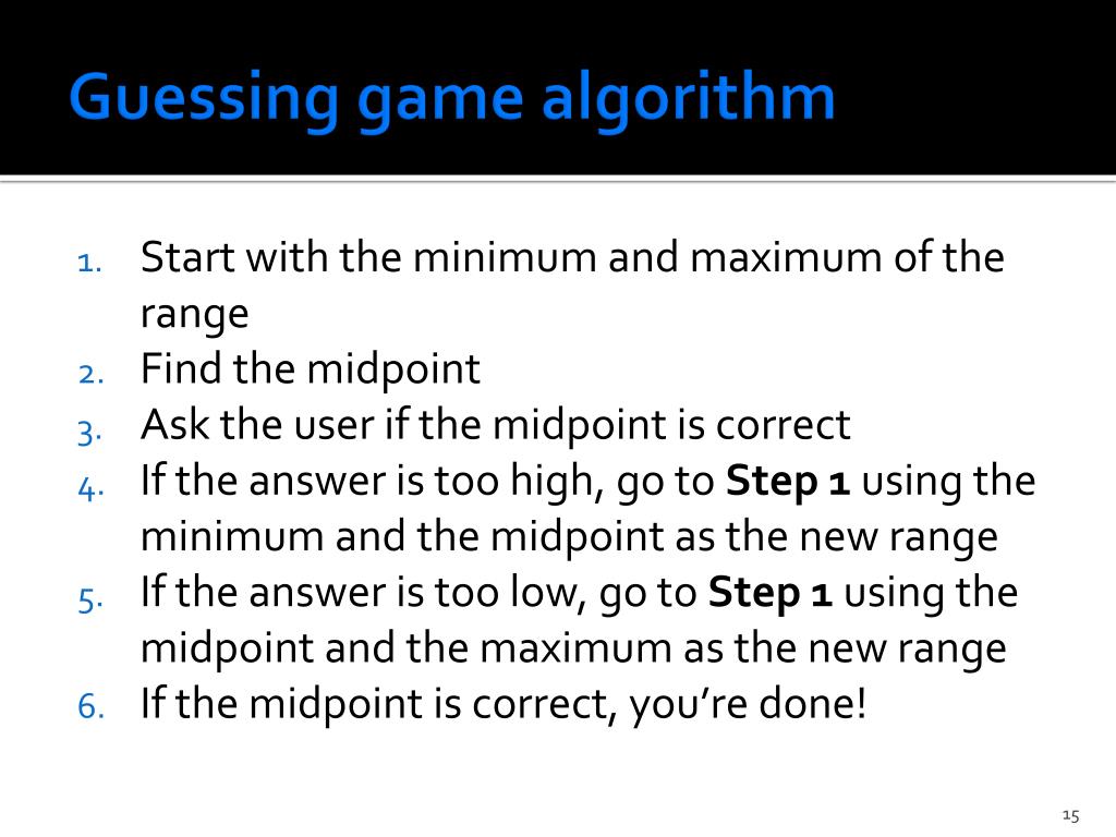 Guessing game algorithm • Start with the minimum and maximum of the range • Find the midpoint • Ask the user if the midpoint is correct • If the answer is too high, go to Step 1 using the minimum and the midpoint as the new range • If the answer is too low, go to Step 1 using the midpoint and the maximum as the new range • If the midpoint is correct, you’re done!