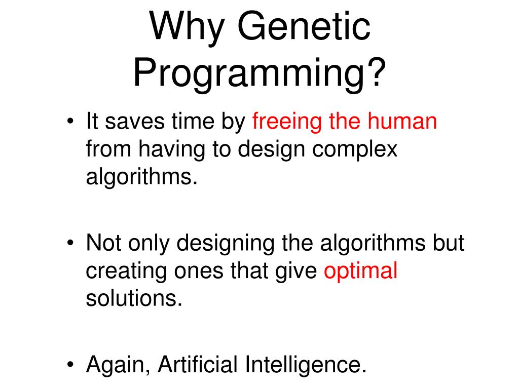 Why Genetic Programming? • It saves time by freeing the human from having to design complex algorithms. • Not only designing the algorithms but creating ones that give optimal solutions. • Again, Artificial Intelligence.