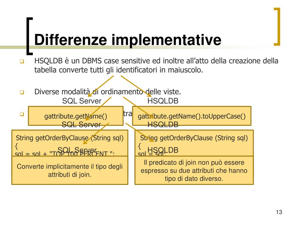 Differenze implementative • HSQLDB è un DBMS case sensitive ed inoltre all’atto della creazione della tabella converte tutti gli identificatori in maiuscolo. • Diverse modalità di ordinamento delle viste. • Predicato di Join espresso tra due attributi di tipo diverso. SQL Server HSQLDB gattribute.getName() gattribute.getName().toUpperCase() SQL Server HSQLDB String getOrderByClause (String sql) { sql = sql + "TOP 100 PERCENT "; return(sql); } String getOrderByClause (String sql) { sql = sql; return(sql); } SQL Server HSQLDB Converte implicitamente il tipo degli attributi di join. Il predicato di join non può essere espresso su due attributi che hanno tipo di dato diverso.