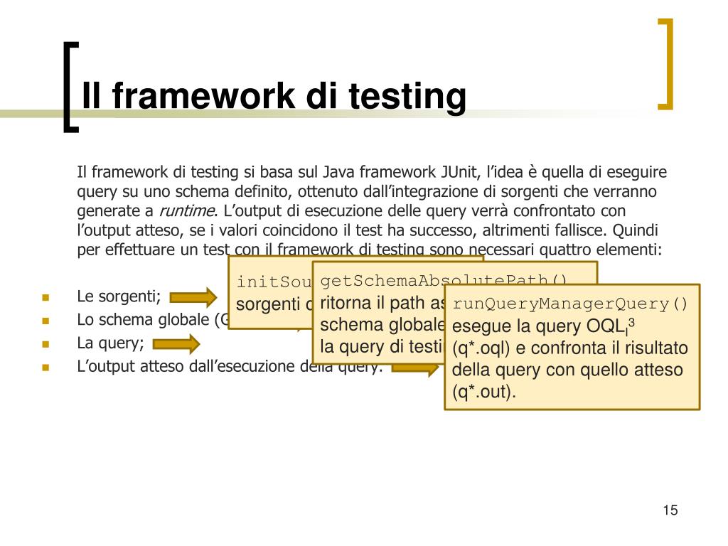 Il framework di testing Il framework di testing si basa sul Java framework JUnit, l’idea è quella di eseguire query su uno schema definito, ottenuto dall’integrazione di sorgenti che verranno generate a runtime. L’output di esecuzione delle query verrà confrontato con l’output atteso, se i valori coincidono il test ha successo, altrimenti fallisce. Quindi per effettuare un test con il framework di testing sono necessari quattro elementi: • Le sorgenti; • Lo schema globale (GS); • La query; • L’output atteso dall’esecuzione della query. initSource() genera le sorgenti da un file SQLDDL getSchemaAbsolutePath()ritorna il path assoluto dello schema globale di riferimento per la query di testing. runQueryManagerQuery()esegue la query OQLI3 (q*.oql) e confronta il risultato della query con quello atteso (q*.out).