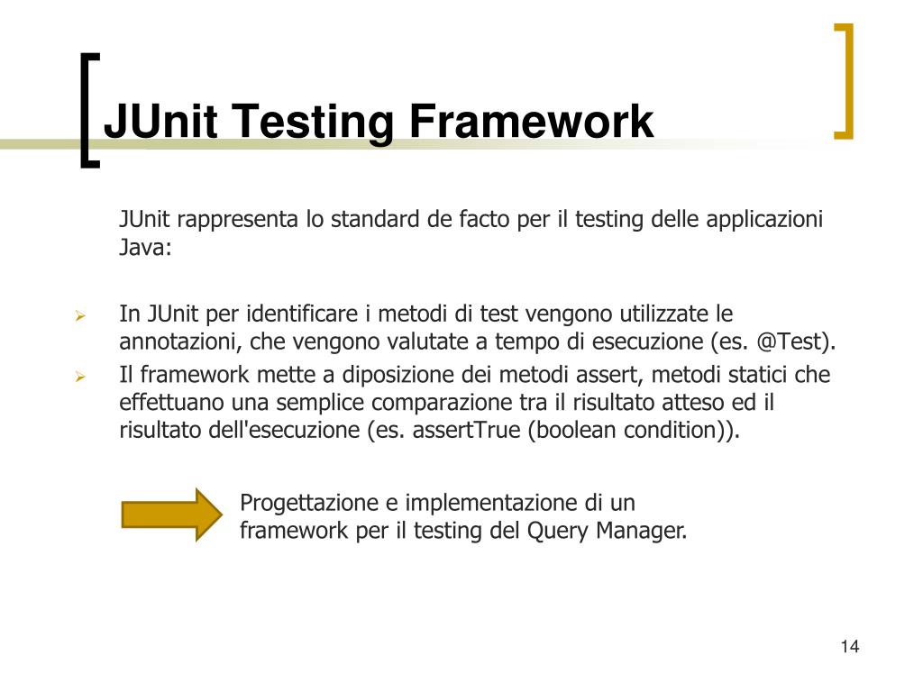 JUnit Testing Framework JUnit rappresenta lo standard de facto per il testing delle applicazioni Java: • In JUnit per identificare i metodi di test vengono utilizzate le annotazioni, che vengono valutate a tempo di esecuzione (es. @Test). • Il framework mette a diposizione dei metodi assert, metodi statici che effettuano una semplice comparazione tra il risultato atteso ed il risultato dell'esecuzione (es. assertTrue (booleancondition)). Progettazione e implementazione di un framework per il testing del Query Manager.
