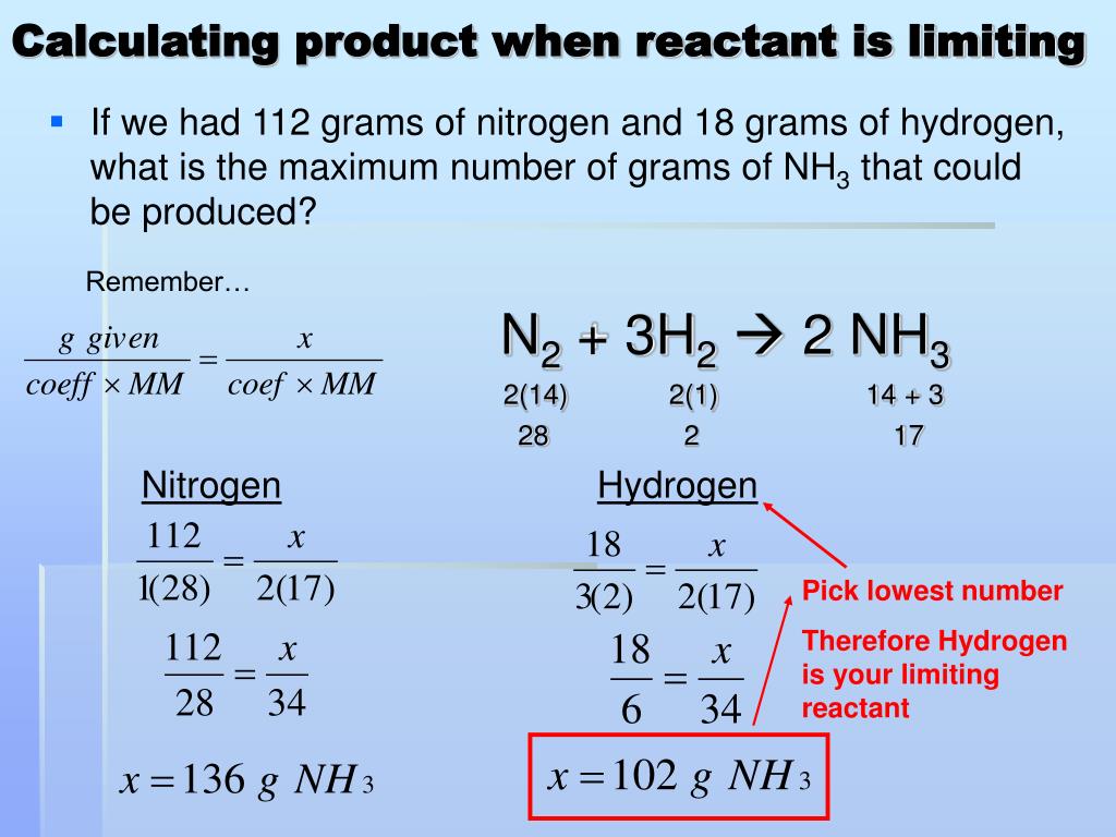 Calculating product when reactant is limiting • If we had 12 moles of nitrogen and 18 moles of hydrogen, what is the maximum number of moles of NH3 that could be produced? N2 + 3H2 2 NH3