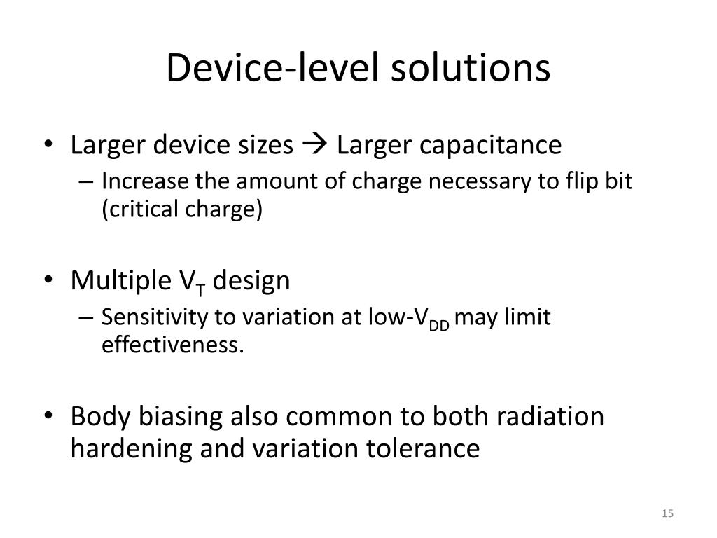 Device-level solutions • Larger device sizes Larger capacitance • Increase the amount of charge necessary to flip bit (critical charge) • Multiple VT design • Sensitivity to variation at low-VDD may limit effectiveness. • Body biasing also common to both radiation hardening and variation tolerance
