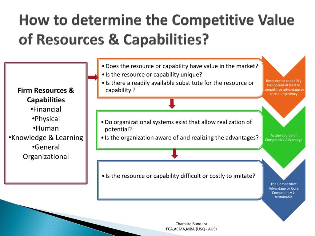 How to determine the Competitive Value of Resources & Capabilities? • Firm Resources & Capabilities • Financial • Physical • Human • Knowledge & Learning • General Organizational Chamara Bandara FCA,ACMA,MBA (USQ - AUS)