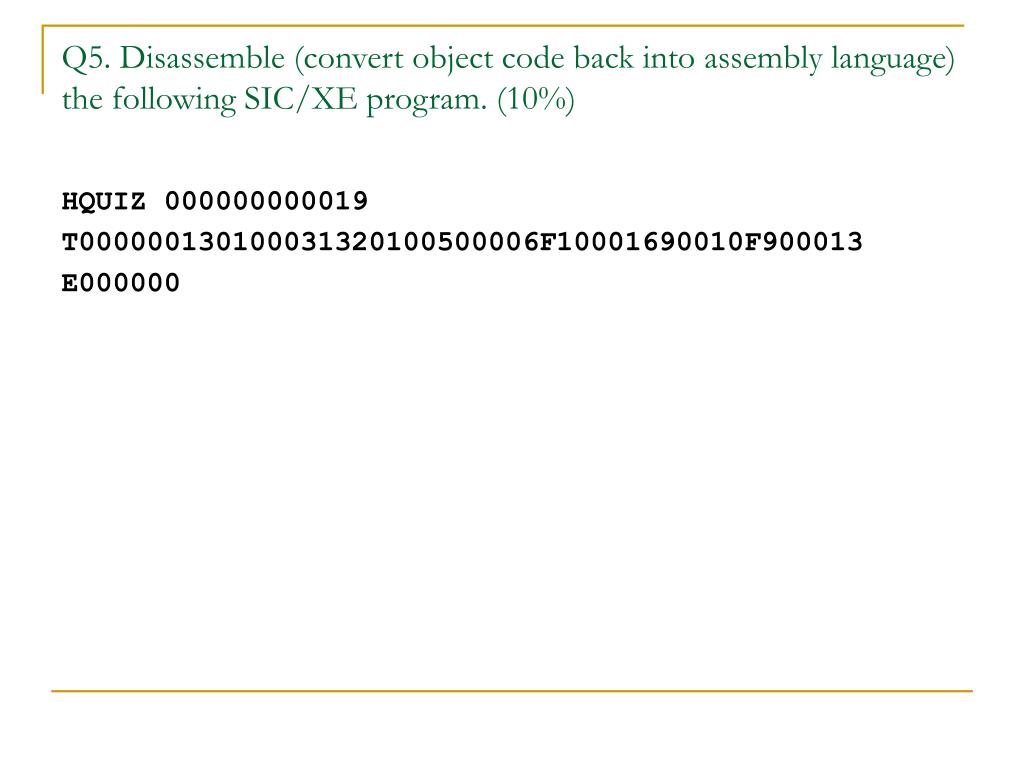 Q5. Disassemble (convert object code back into assembly language) the following SIC/XE program. (10%) HQUIZ 000000000019 T000000130100031320100500006F10001690010F900013 E000000