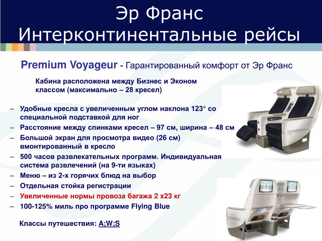 Эр ФрансИнтерконтинентальные рейсы Premium Voyageur- Гарантированный комфорт от Эр Франс Кабина расположена между Бизнес и Эконом классом (максимально – 28 кресел) • Удобные кресла с увеличенным углом наклона 123° со специальной подставкой для ног • Расстояние между спинками кресел – 97 см, ширина – 48 см • Большой экран для просмотра видео (26 см) вмонтированный в кресло • 500 часов развлекательных программ. Индивидуальная система развлечений (на 9-ти языках) • Меню – из 2-х горячих блюд на выбор • Отдельная стойка регистрации • Увеличенные нормы провоза багажа 2 x23кг • 100-125% миль про программе Flying Blue Классы путешествия: A;W;S