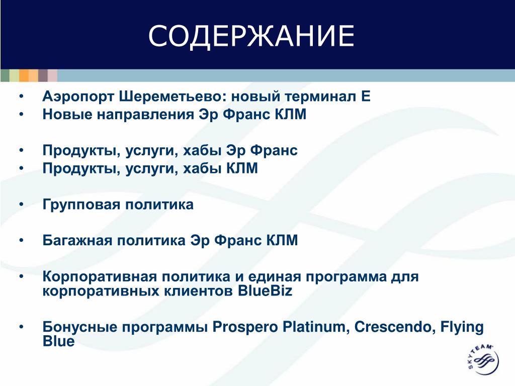 СОДЕРЖАНИЕ • Аэропорт Шереметьево: новый терминал Е • Новые направления Эр Франс КЛМ • Продукты, услуги, хабы Эр Франс • Продукты, услуги, хабы КЛМ • Групповая политика • Багажная политика Эр Франс КЛМ • Корпоративная политика и единая программа для корпоративных клиентов BlueBiz • Бонусные программы Prospero Platinum,Crescendo, Flying Blue