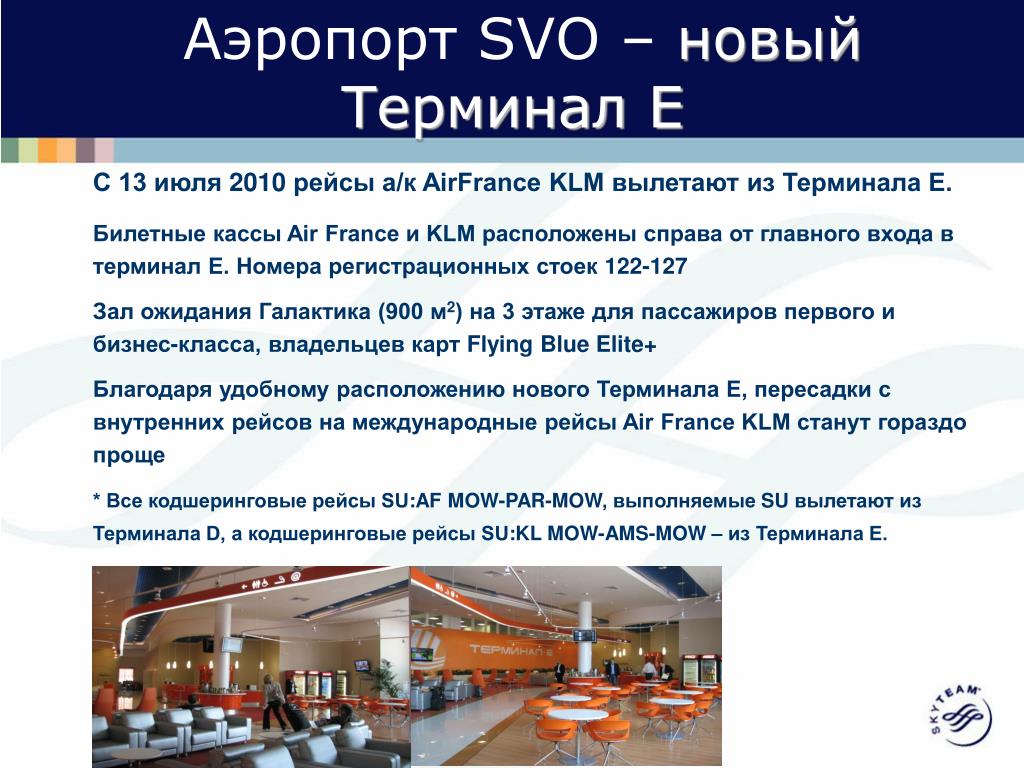 Аэропорт SVO –новый Терминал Е С 13 июля 2010 рейсы а/к AirFrance KLM вылетают из Терминала Е. Билетные кассы Air France и KLM расположены справа от главного входа в терминал Е. Номера регистрационных стоек 122-127 Зал ожидания Галактика (900 м2) на 3 этаже для пассажиров первого и бизнес-класса, владельцев карт Flying Blue Elite+ Благодаря удобному расположению нового Терминала Е, пересадки с внутренних рейсов на международные рейсы Air France KLM станут гораздо проще * Все кодшеринговые рейсы SU:AFMOW-PAR-MOW, выполняемые SU вылетают изТерминала D, а кодшеринговые рейсы SU:KLMOW-AMS-MOW – изТерминала Е.