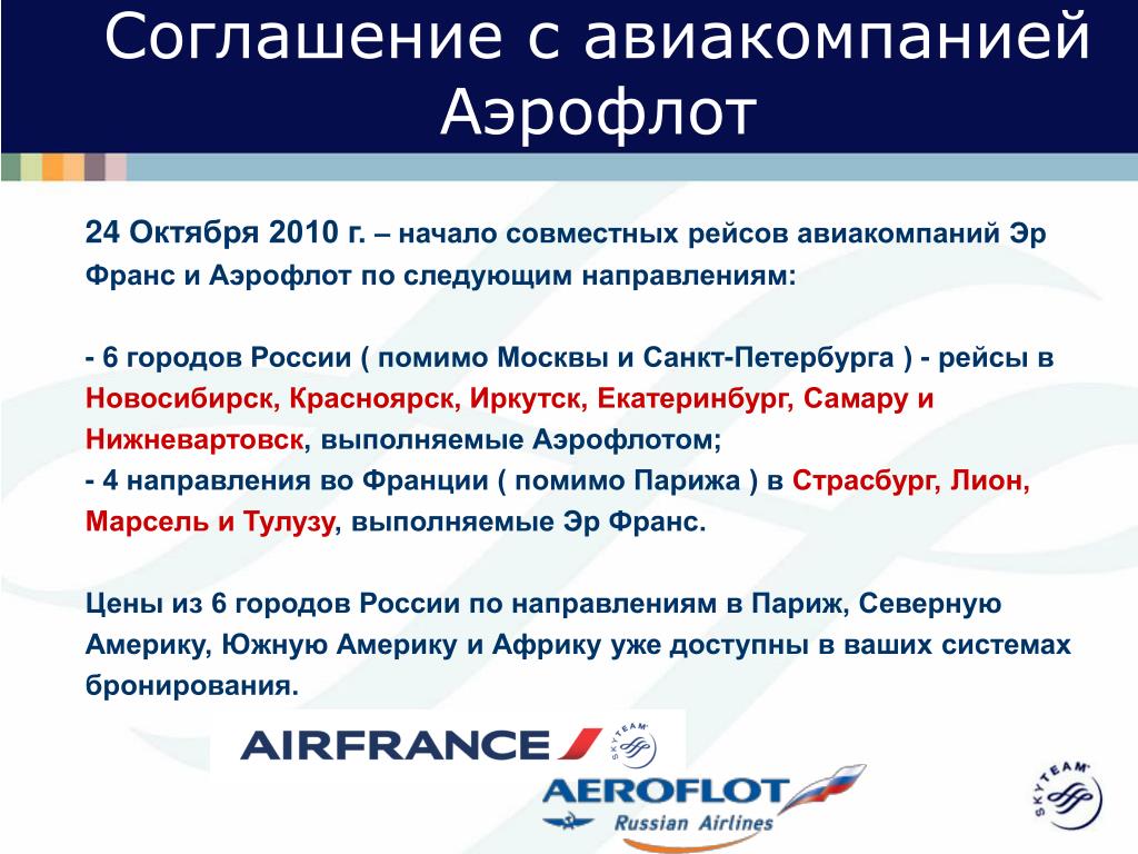 Соглашение с авиакомпанией Аэрофлот 24 Октября 2010 г. – начало совместных рейсов авиакомпаний Эр Франс и Аэрофлот по следующим направлениям: - 6 городов России ( помимо Москвы и Санкт-Петербурга ) - рейсы в Новосибирск, Красноярск, Иркутск, Екатеринбург, Самару и Нижневартовск, выполняемые Аэрофлотом; - 4 направления во Франции ( помимо Парижа ) в Страсбург, Лион, Марсель и Тулузу, выполняемые Эр Франс. Цены из 6 городов России по направлениям в Париж, Северную Америку, Южную Америку и Африку уже доступны в ваших системах бронирования.