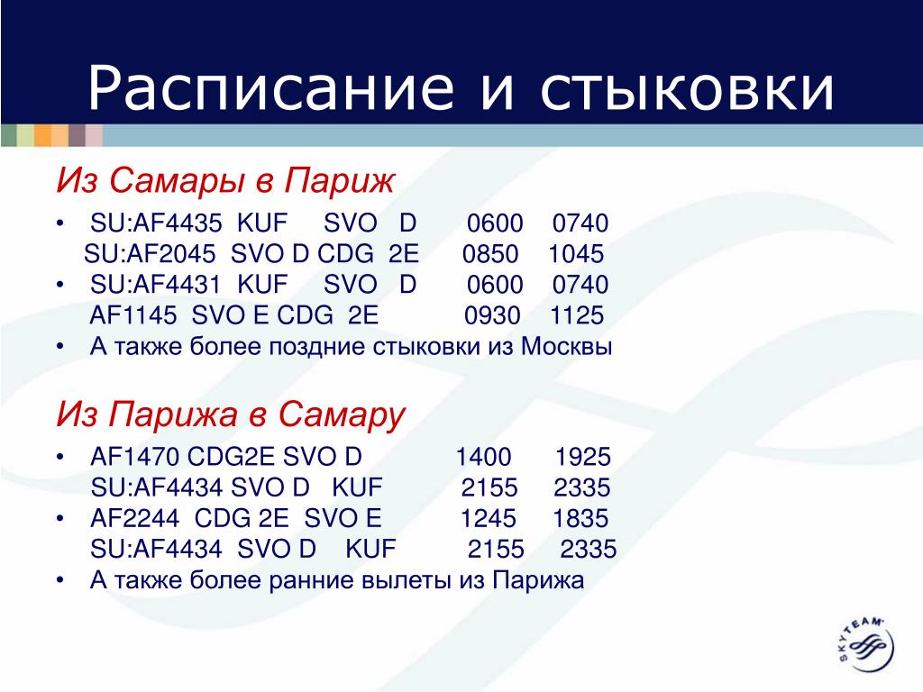 Расписание и стыковки Из Самары в Париж • SU:AF4435KUF SVO D0600 0740 SU:AF2045 SVO D CDG 2E 0850 1045 • SU:AF4431 KUFSVO D0600 0740 AF1145SVO E CDG 2E0930 1125 • А также более поздние стыковки из Москвы Из Парижа в Самару • AF1470 CDG2E SVO D 1400 1925 SU:AF4434 SVO D KUF 2155 2335 • AF2244 CDG 2E SVO E 1245 1835 SU:AF4434 SVO D KUF 2155 2335 • А также более ранние вылеты из Парижа