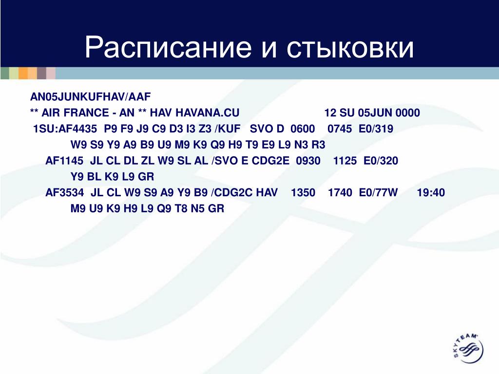 Расписание и стыковки AN05JUNKUFHAV/AAF ** AIR FRANCE - AN ** HAV HAVANA.CU 12 SU 05JUN 0000 1SU:AF4435 P9 F9 J9 C9 D3 I3 Z3 /KUF SVO D 0600 0745 E0/319 W9 S9 Y9 A9 B9 U9 M9 K9 Q9 H9 T9 E9 L9 N3 R3 AF1145 JL CL DL ZL W9 SL AL /SVO E CDG2E 0930 1125 E0/320 Y9 BL K9 L9 GR AF3534 JL CL W9 S9 A9 Y9 B9 /CDG2C HAV 1350 1740 E0/77W 19:40 M9 U9 K9 H9 L9 Q9 T8 N5 GR