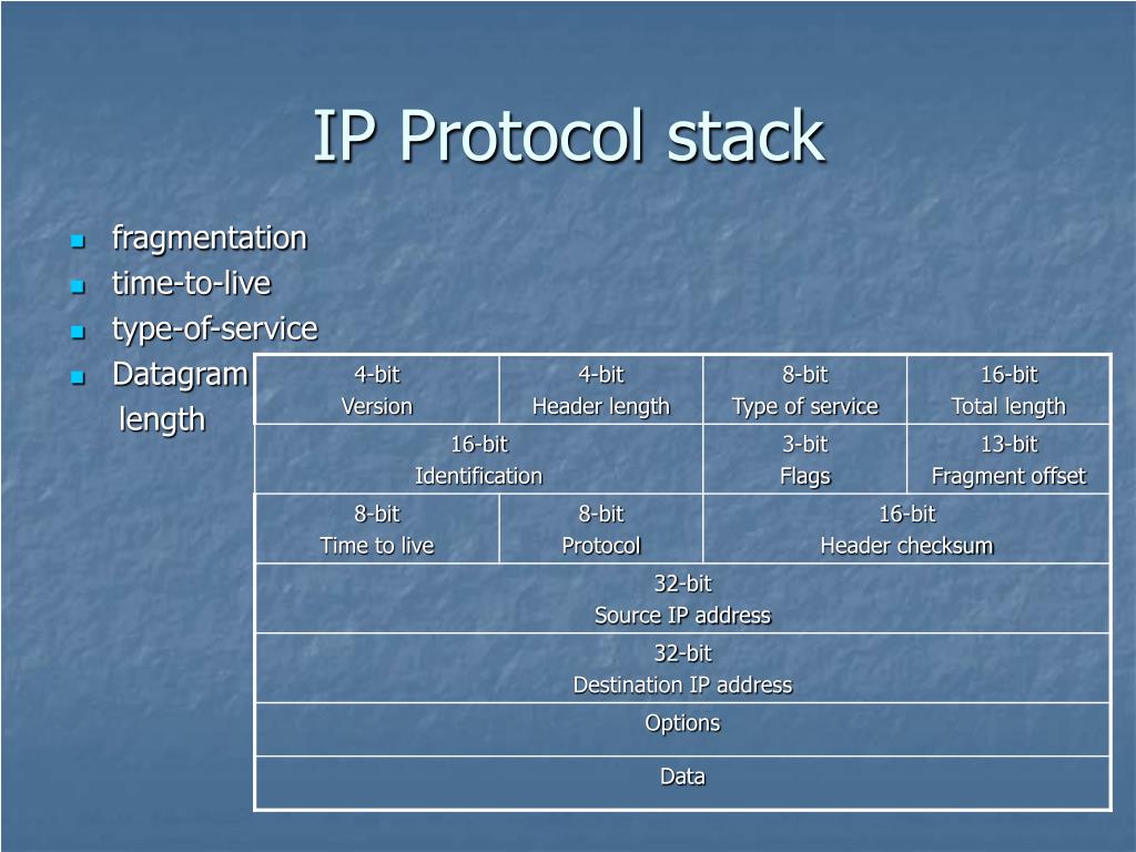 IP Protocol stack • fragmentation • time-to-live • type-of-service • Datagram length