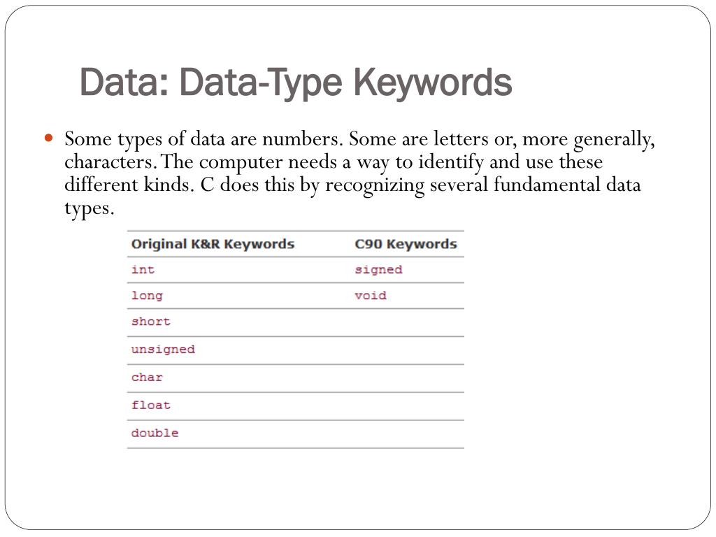 Data: Data-Type Keywords • Some types of data are numbers. Some are letters or, more generally, characters. The computer needs a way to identify and use these different kinds. C does this by recognizing several fundamental data types.
