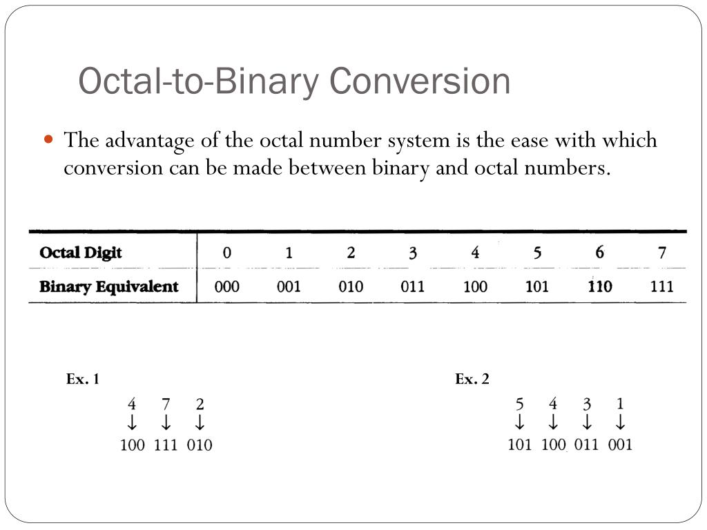 Octal-to-Binary Conversion • The advantage of the octal number system is the ease with which conversion can be made between binary and octal numbers. Ex. 1 Ex. 2