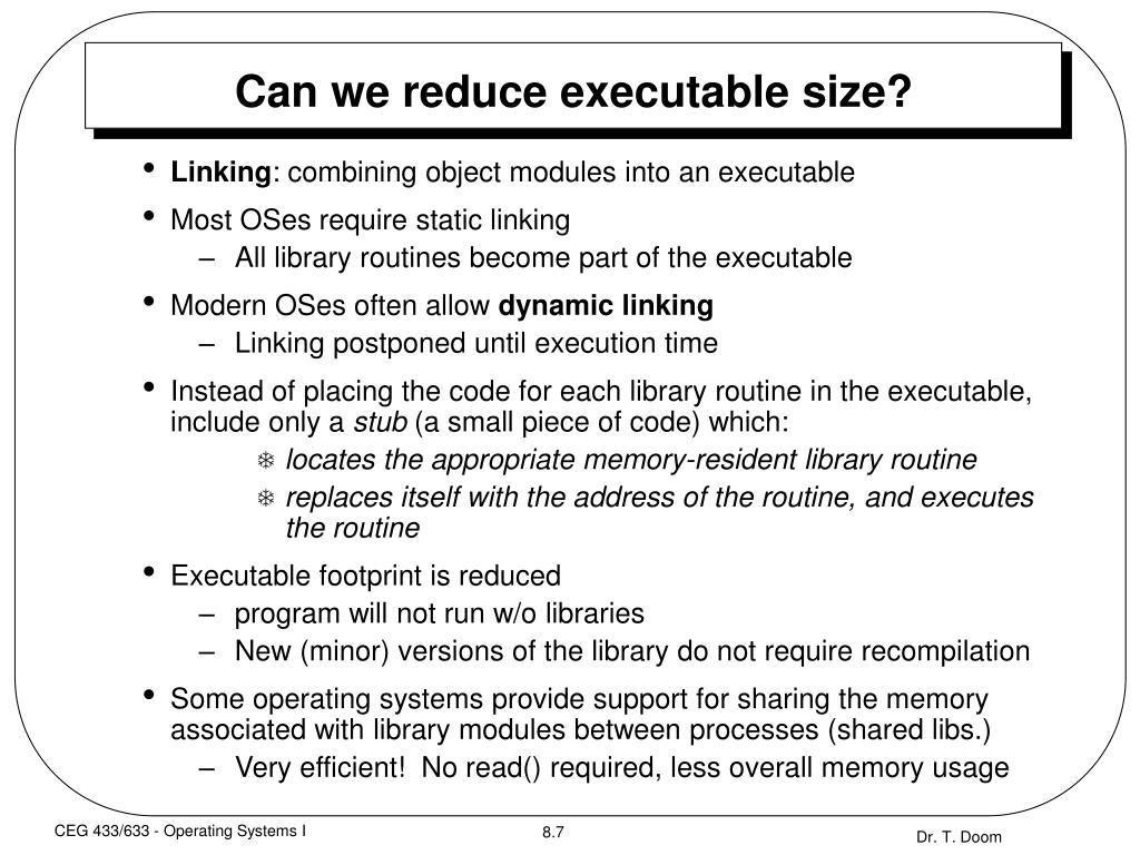 Can we reduce executable size? • Linking: combining object modules into an executable • Most OSes require static linking • All library routines become part of the executable • Modern OSes often allow dynamic linking • Linking postponed until execution time • Instead of placing the code for each library routine in the executable, include only a stub (a small piece of code) which: • locates the appropriate memory-resident library routine • replaces itself with the address of the routine, and executes the routine • Executable footprint is reduced • program will not run w/o libraries • New (minor) versions of the library do not require recompilation • Some operating systems provide support for sharing the memory associated with library modules between processes (shared libs.) • Very efficient! No read() required, less overall memory usage CEG 433/633 - Operating Systems I