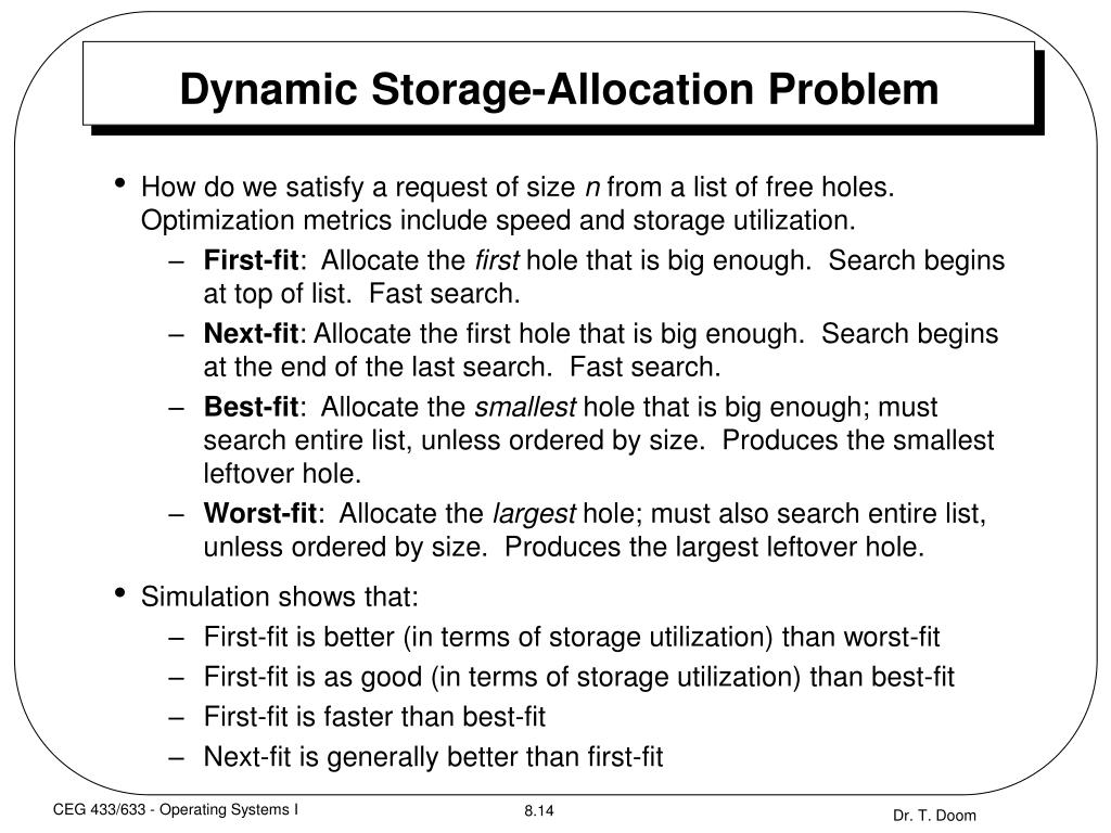 Dynamic Storage-Allocation Problem • How do we satisfy a request of size n from a list of free holes. Optimization metrics include speed and storage utilization. • First-fit: Allocate the first hole that is big enough. Search begins at top of list. Fast search. • Next-fit: Allocate the first hole that is big enough. Search begins at the end of the last search. Fast search. • Best-fit: Allocate the smallest hole that is big enough; must search entire list, unless ordered by size. Produces the smallest leftover hole. • Worst-fit: Allocate the largest hole; must also search entire list, unless ordered by size. Produces the largest leftover hole. • Simulation shows that: • First-fit is better (in terms of storage utilization) than worst-fit • First-fit is as good (in terms of storage utilization) than best-fit • First-fit is faster than best-fit • Next-fit is generally better than first-fit CEG 433/633 - Operating Systems I
