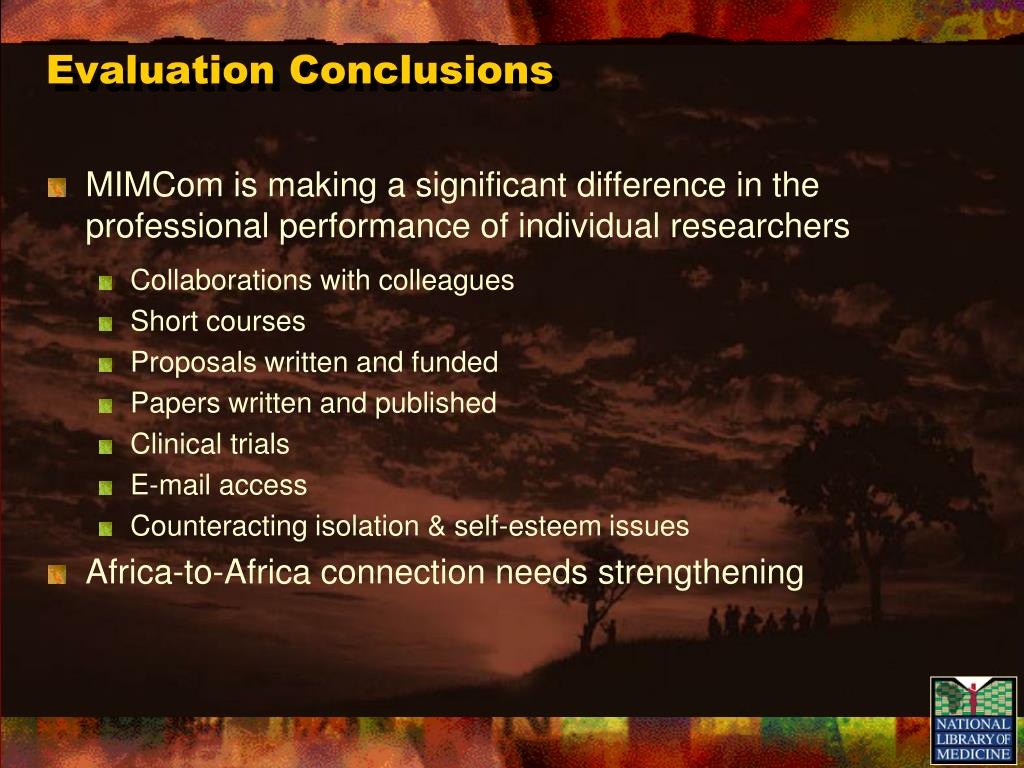 Evaluation Conclusions • MIMCom is making a significant difference in the professional performance of individual researchers • Collaborations with colleagues • Short courses • Proposals written and funded • Papers written and published • Clinical trials • E-mail access • Counteracting isolation & self-esteem issues • Africa-to-Africa connection needs strengthening
