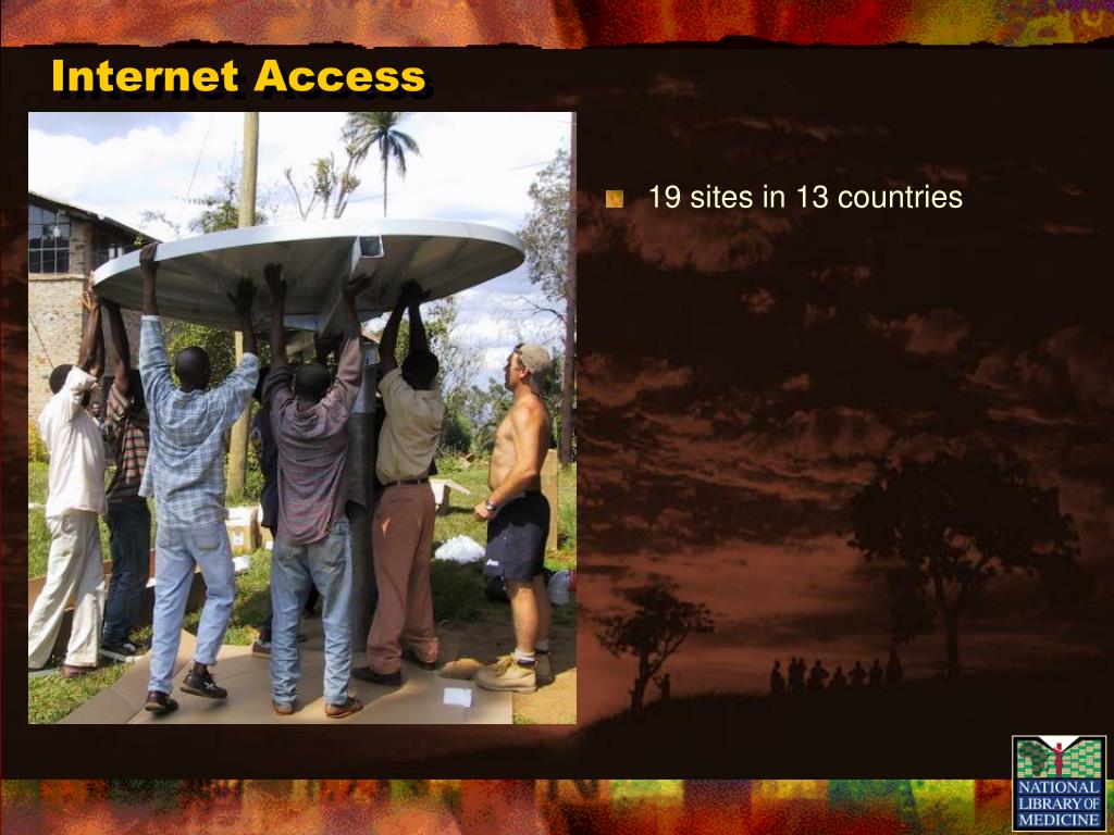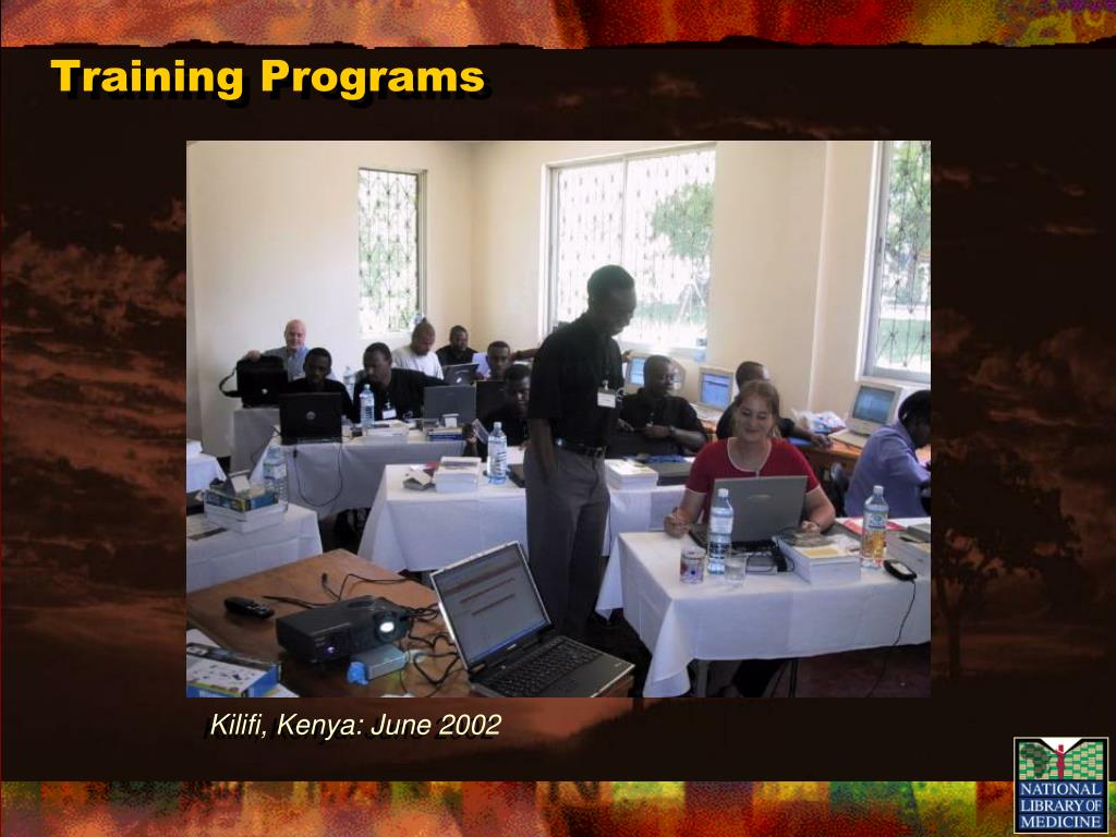 Resources for International Librarians • Resources for International Librarians, Health Professionals and Researchers in Developing Countries: http://www.nlm.nih.gov/psd/ref/international.htmlincluding many NLM products which are free to anyone with a web browser.