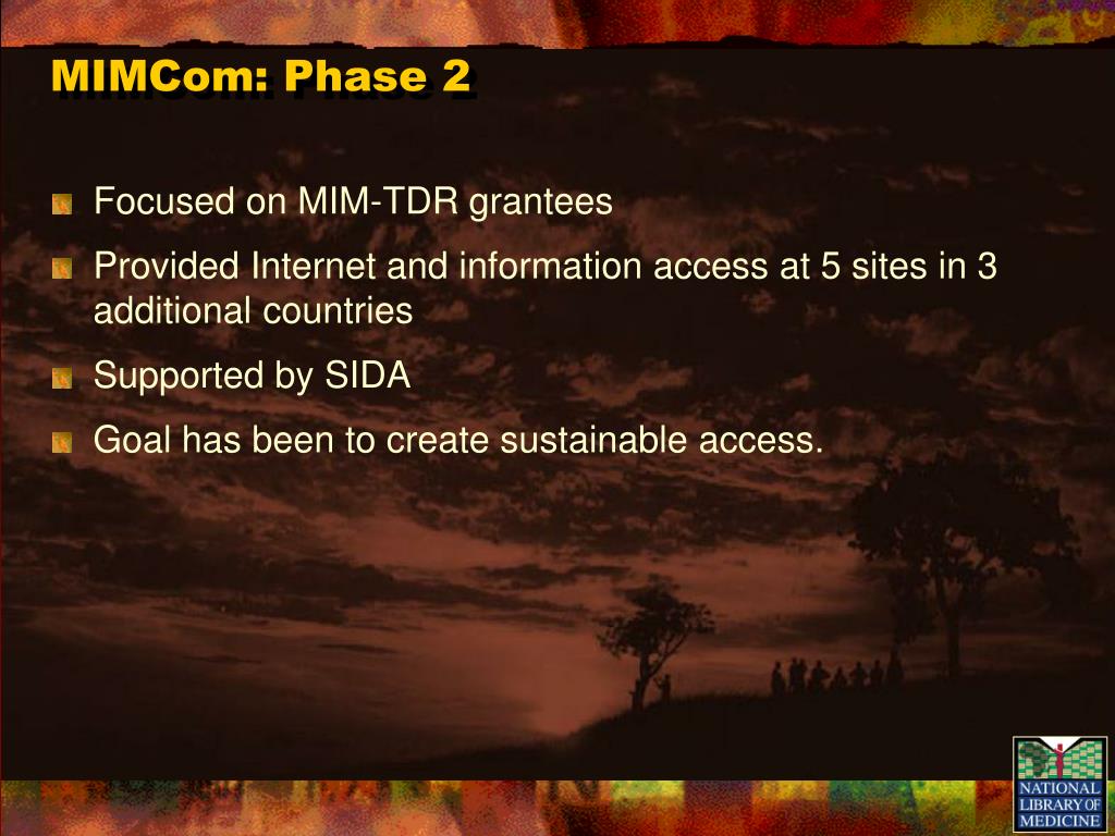 MIMCom: Phase 2 • Focused on MIM-TDR grantees • Provided Internet and information access at 5 sites in 3 additional countries • Supported by SIDA • Goal has been to create sustainable access.