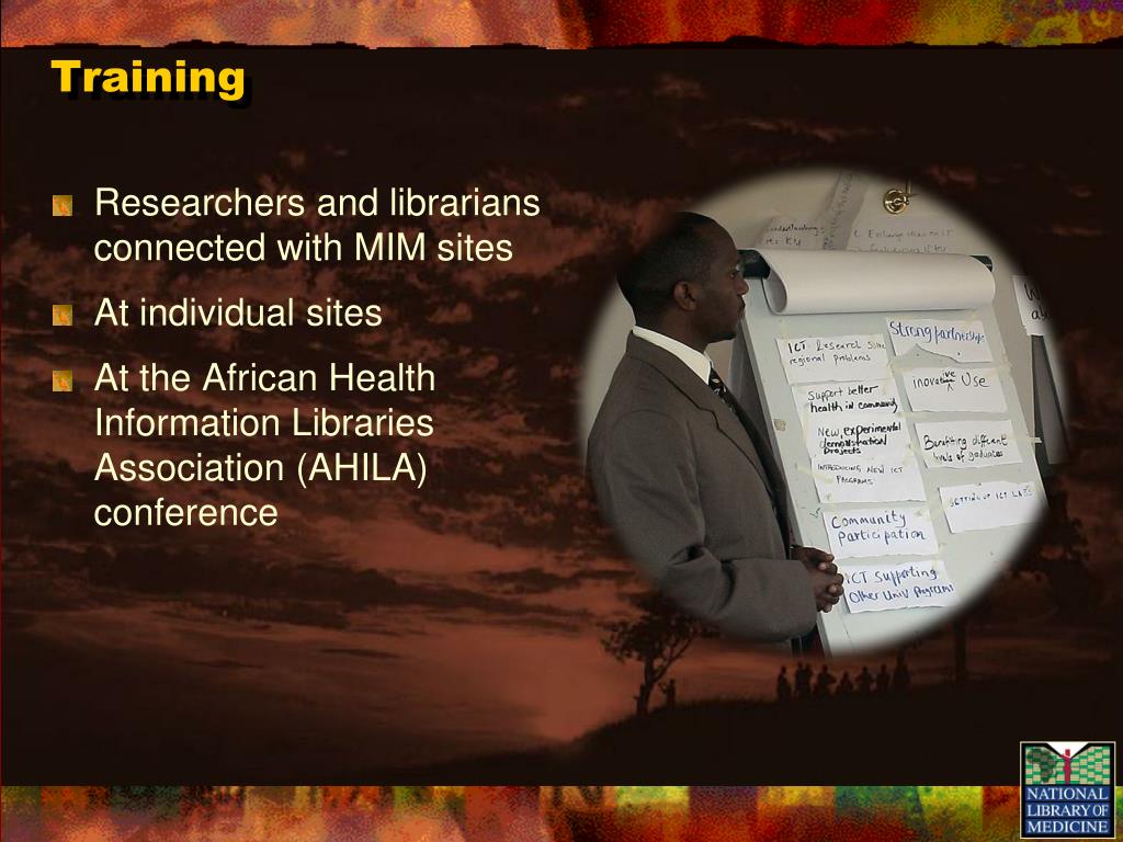 Training • Researchers and librarians connected with MIM sites • At individual sites • At the African Health Information Libraries Association (AHILA) conference