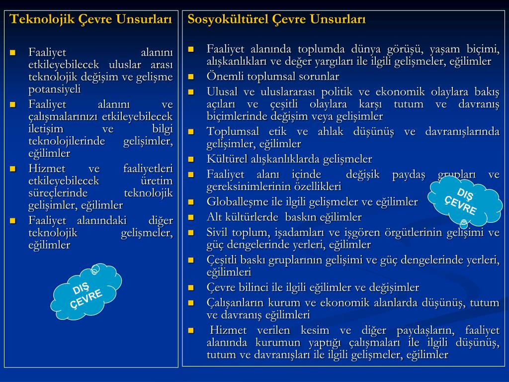 Teknolojik Çevre Unsurları Faaliyet alanını etkileyebilecek uluslar arası teknolojik değişim ve gelişme potansiyeli Faaliyet alanını ve çalışmalarınızı etkileyebilecek iletişim ve bilgi teknolojilerinde gelişimler, eğilimler Hizmet ve faaliyetleri etkileyebilecek üretim süreçlerinde teknolojik gelişimler, eğilimler Faaliyet alanındaki diğer teknolojik gelişmeler, eğilimler Sosyokültürel Çevre Unsurları Faaliyet alanında toplumda dünya görüşü, yaşam biçimi, alışkanlıkları ve değer yargıları ile ilgili gelişmeler, eğilimler Önemli toplumsal sorunlar Ulusal ve uluslararası politik ve ekonomik olaylara bakış açıları ve çeşitli olaylara karşı tutum ve davranış biçimlerinde değişim veya gelişimler Toplumsal etik ve ahlak düşünüş ve davranışlarında gelişimler, eğilimler Kültürel alışkanlıklarda gelişmeler Faaliyet alanı içinde değişik paydaş grupları ve gereksinimlerinin özellikleri Globalleşme ile ilgili gelişmeler ve eğilimler Alt kültürlerde baskın eğilimler Sivil toplum, işadamları ve işgören örgütlerinin gelişimi ve güç dengelerinde yerleri, eğilimler Çeşitli baskı gruplarının gelişimi ve güç dengelerinde yerleri, eğilimleri Çevre bilinci ile ilgili eğilimler ve değişimler Çalışanların kurum ve ekonomik alanlarda düşünüş, tutum ve davranış eğilimleri Hizmet verilen kesim ve diğer paydaşların, faaliyet alanında kurumun yaptığı çalışmaları ile ilgili düşünüş, tutum ve davranışları ile ilgili gelişmeler, eğilimler DIŞ ÇEVRE DIŞ ÇEVRE