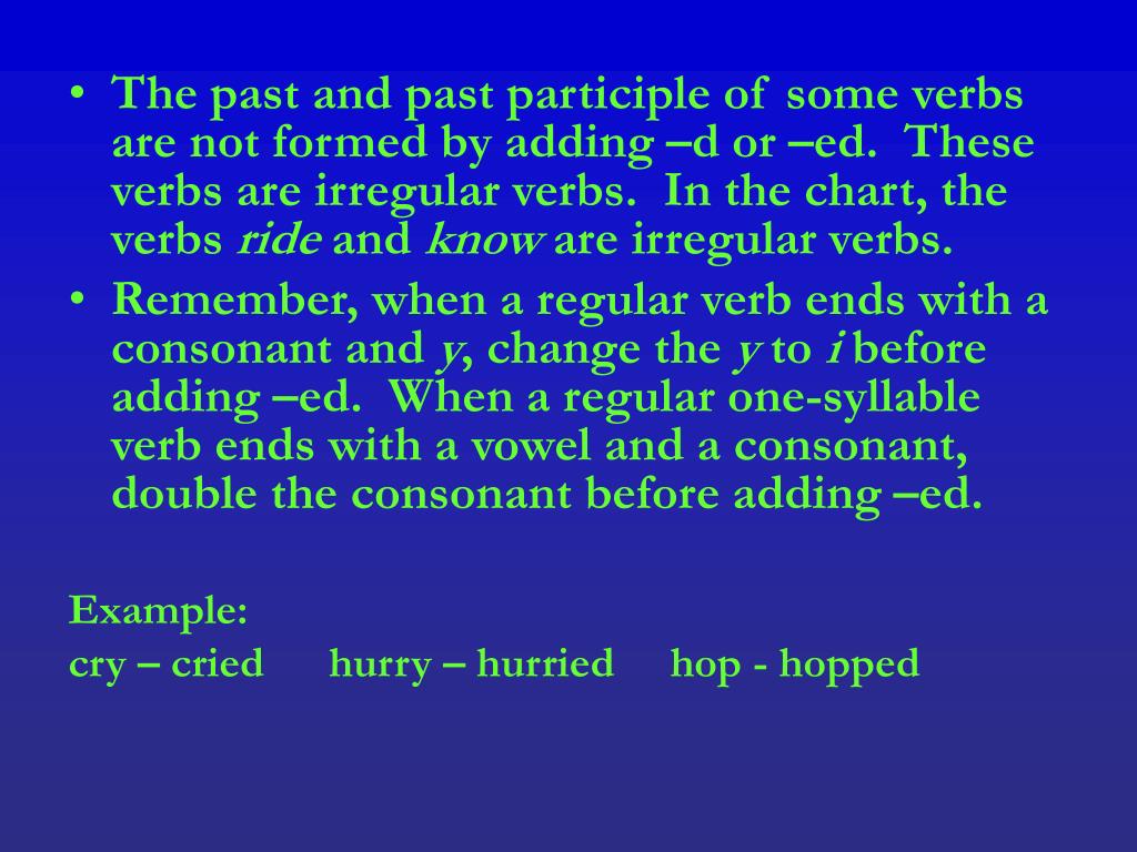 The past and past participle of some verbs are not formed by adding –d or –ed. These verbs are irregular verbs. In the chart, the verbs ride and know are irregular verbs. • Remember, when a regular verb ends with a consonant and y, change the y to i before adding –ed. When a regular one-syllable verb ends with a vowel and a consonant, double the consonant before adding –ed. Example: cry – cried hurry – hurried hop - hopped