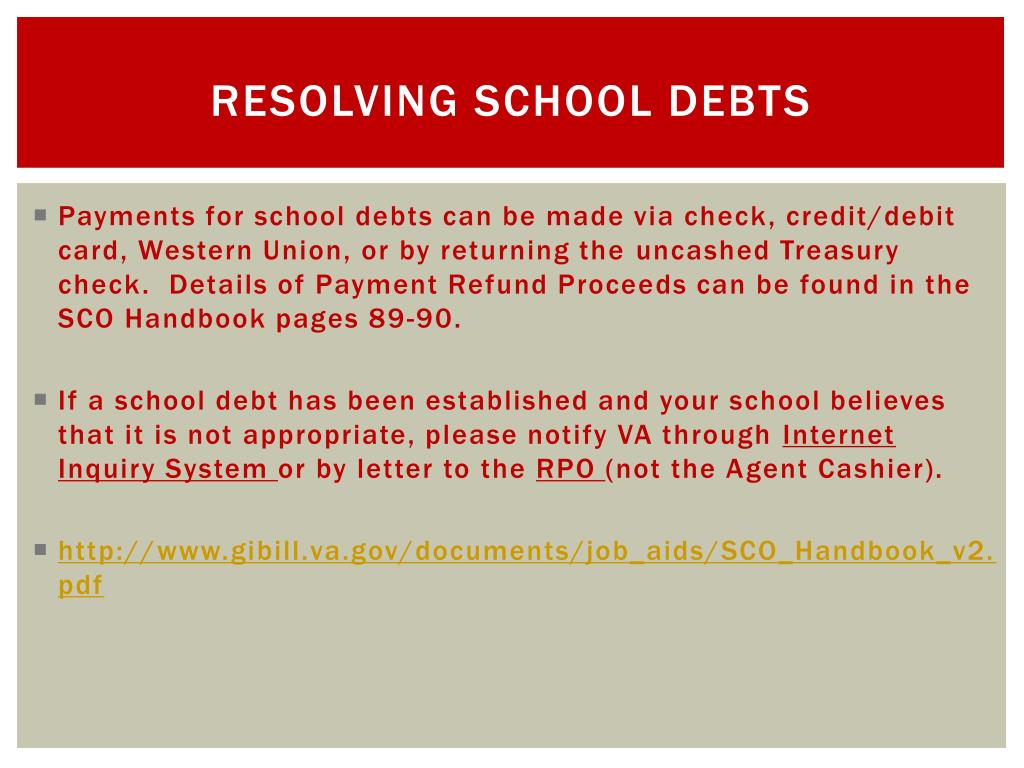 Resolving school debts • Payments for school debts can be made via check, credit/debit card, Western Union, or by returning the uncashed Treasury check. Details of Payment Refund Proceeds can be found in the SCO Handbook pages 89-90. • If a school debt has been established and your school believes that it is not appropriate, please notify VA through Internet Inquiry System or by letter to the RPO (not the Agent Cashier). • http://www.gibill.va.gov/documents/job_aids/SCO_Handbook_v2.pdf