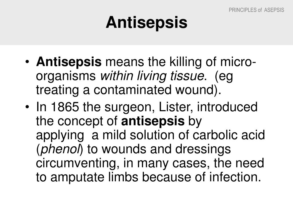 Antisepsis • Antisepsis means the killing of micro-organisms within living tissue. (eg treating a contaminated wound). • In 1865 the surgeon, Lister, introduced the concept of antisepsis by applying a mild solution of carbolic acid (phenol) to wounds and dressings circumventing, in many cases, the need to amputate limbs because of infection.