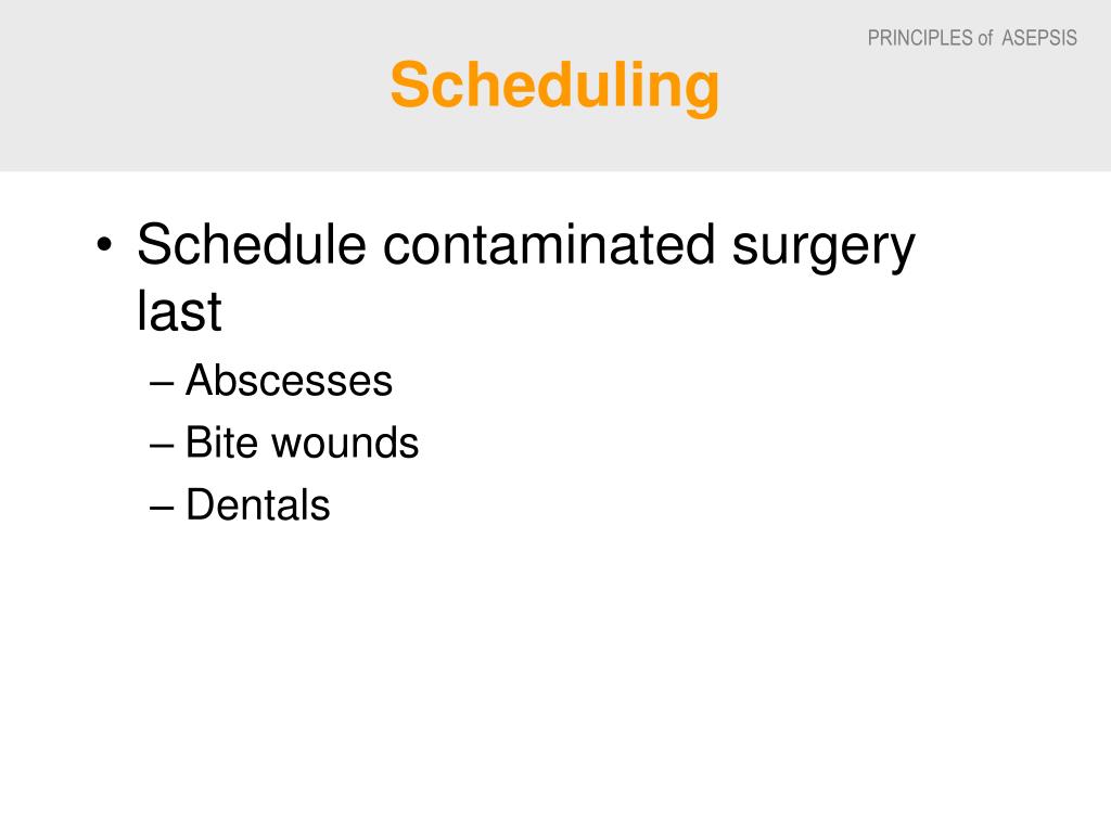 Scheduling • Schedule contaminated surgery last • Abscesses • Bite wounds • Dentals