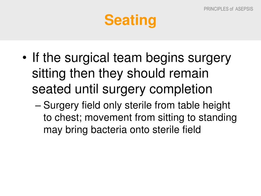 Seating • If the surgical team begins surgery sitting then they should remain seated until surgery completion • Surgery field only sterile from table height to chest; movement from sitting to standing may bring bacteria onto sterile field