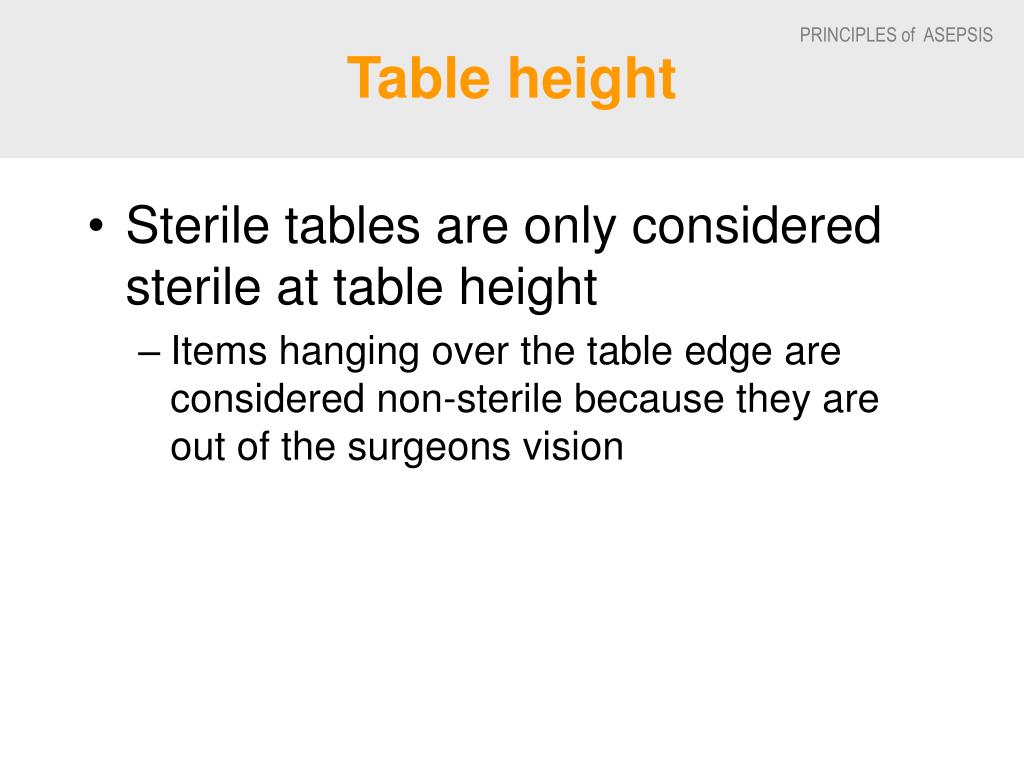 Table height • Sterile tables are only considered sterile at table height • Items hanging over the table edge are considered non-sterile because they are out of the surgeons vision